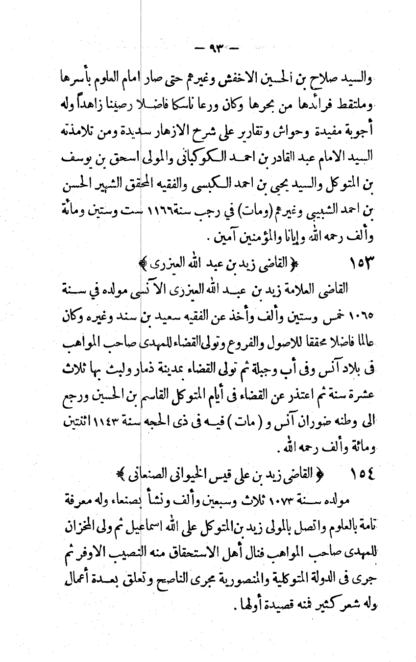 وَالسَّيِّد صَلَاح بن الْحُسَيْن الْأَخْفَش وَغَيرهم حَتَّى صَار امام الْعُلُوم بأسرها وملتقط فرائدها من بحرها وَكَانَ ورعا ناسكا فَاضلا رصينا زاهدا وَله أجوبة مفيدة وحواش وتقارير على شرح الأزهار سديدة وَمن تلامذته السَّيِّد الإِمَام عبد الْقَادِر بن احْمَد الكوكبانى وَالْمولى اسحق بن يُوسُف بن المتَوَكل وَالسَّيِّد يحيى بن احْمَد الكبسى والفقيه الْمُحَقق الشهير الْحسن بن احْمَد الشبيبي وَغَيرهم وَمَات فِي رَجَب سنة 1166 سِتّ وَسِتِّينَ وَمِائَة وَألف رَحمَه وإيانا وَالْمُؤمنِينَ آمين