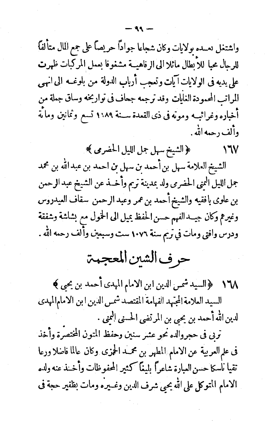 الشَّيْخ الْعَلامَة سهل بن أَحْمد بن سهل بن أَحْمد بن عبد الله بن مُحَمَّد جمل اللَّيْل الْيُمْنَى الحضرمى ولد بِمَدِينَة تريم وَأخذ عَن الشَّيْخ عبد الرَّحْمَن بن علوى بافقيه وَالشَّيْخ أَحْمد بن عمر وَعبد الرَّحْمَن سقاف العيدروس وَغَيرهم وَكَانَ جيد الْفَهم حسن الْحِفْظ يمِيل إِلَى الخمول مَعَ بشاشة وشفقة ودرس وَأفْتى وَمَات فِي تريم سنة 1076 سِتّ وَسبعين وَألف رَحمَه الله