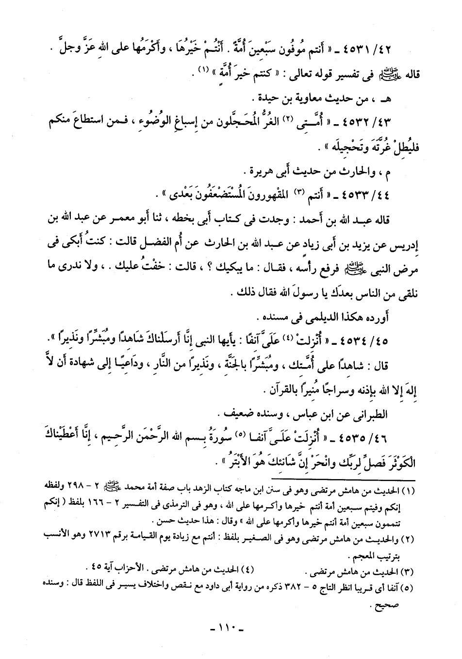 42/ 4531 - "أَنتم مُوفُون سَبْعِينَ أُمَّةً. أَنْتُمْ خَيرُهَا، وأَكْرَمُها على اللهِ عَزَّ وجلَّ.