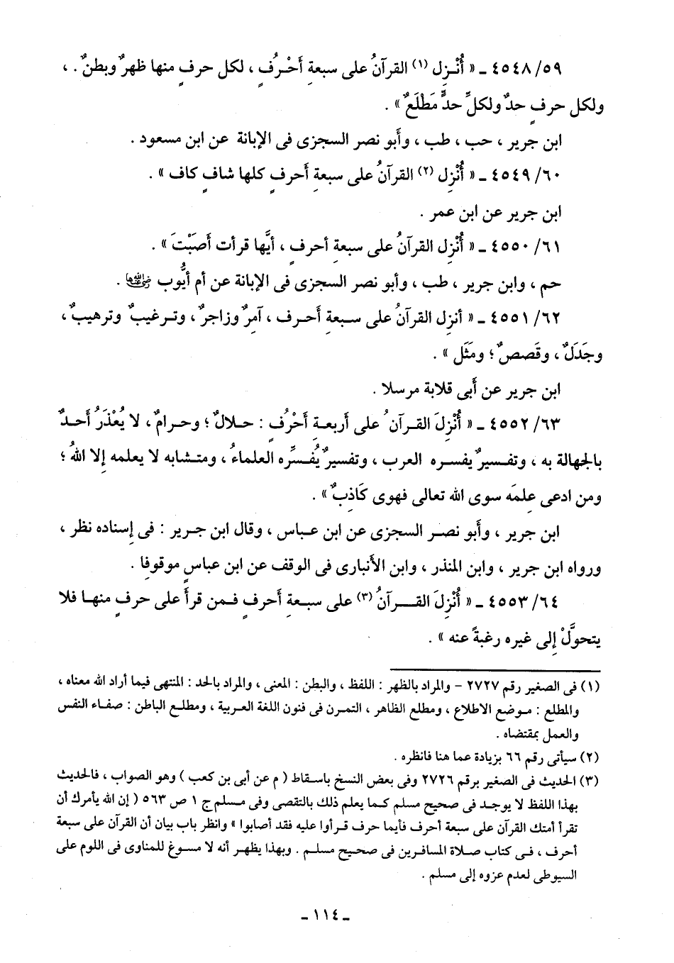 59/ 4548 - "أُنْزِل (¬1) القرآنُ على سبعةِ أَحْرُفٍ، لكل حرفٍ منها ظهرٌ وبطنٌ، ولكل حرفٍ حدٌ ولكلِّ حدٍّ مَطْلَعٌ".