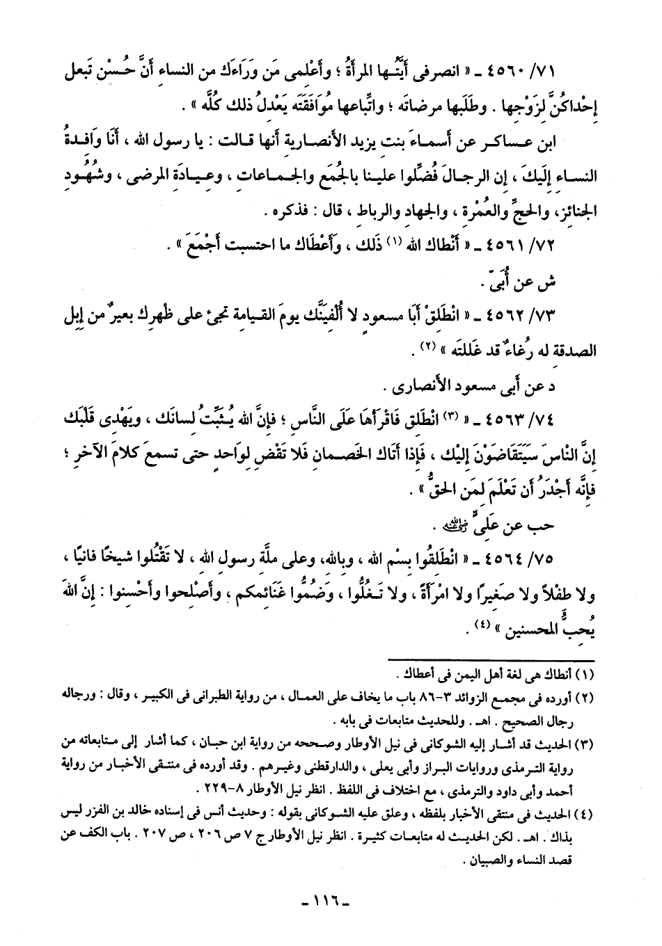 71/ 4560 - "انصرفى أيَّتُها المرأةُ؛ وأَعْلِمى مَن وَرَاءَك من النساءِ أَنَّ حُسْن تَبعل إِحْداكُنَّ لِزَوْجِها. وطَلَبها مرضاتَه؛ واتِّباعها مُوَافَقَتَه يَعْدِلُ ذلك كُلَّه".