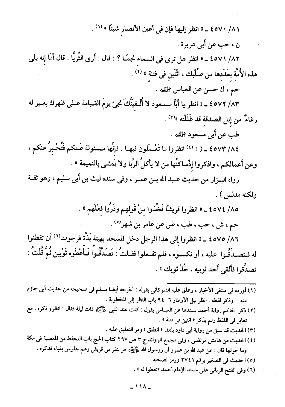 (¬4) الحديث من هامش مرتضى، وفي مجمع الزوائد ج 3 ص 297 كتاب الحج باب التحفظ من المعصية في مكة وما حولها قال: عن عبد الله بن عمرو أن ررسول الله - صلى الله عليه وسلم - مر بنفر من قريش وهم جلوس بقباء فذكره.