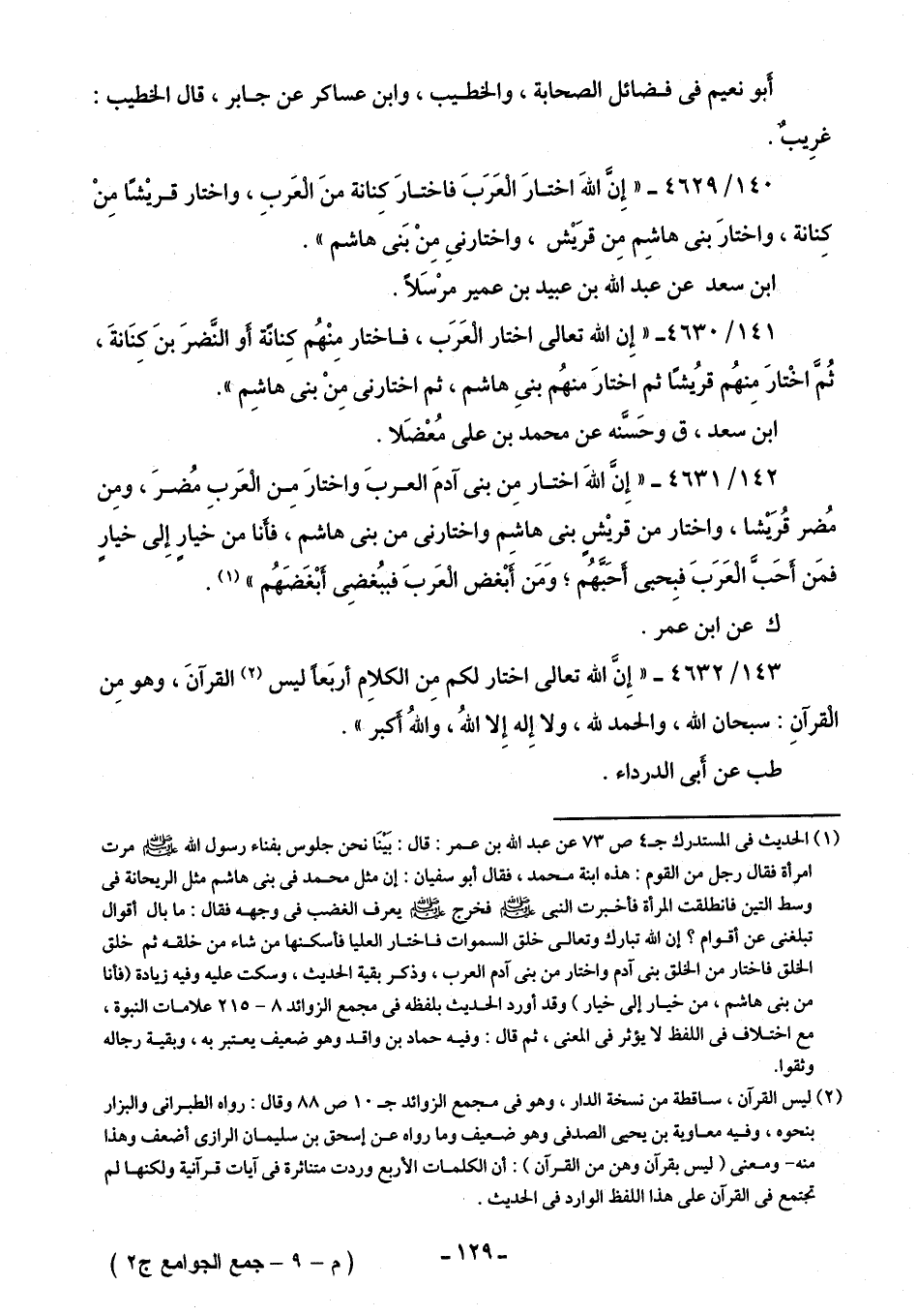 140/ 4629 - "إِنَّ اللهَ اختارَ الْعَرَبَ فاختارَ كِنانة منَ الْعَربِ، واختار قريشًا مِنْ كِنانة، واختارَ بني هاشِم مِن قرَيش، واختارني مِنْ بَنى هاشم".