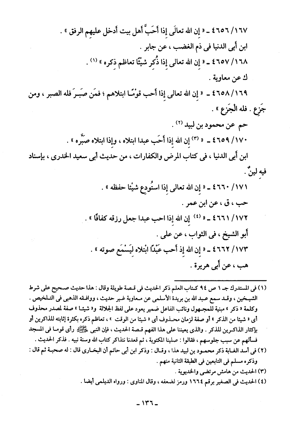 170/ 4659 - " (¬3) إِن الله إِذا أحَب عبدا ابتلاه، وإذا ابتلاه صَبَّره".