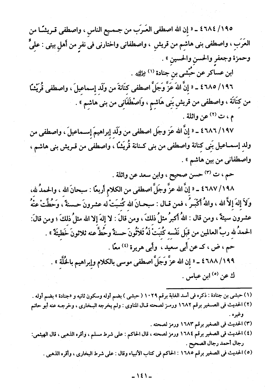 196/ 4685 - "إِنَّ اللهَ عَزَّ وَجَلَّ اصطفى كِنَانةَ من وَلَدِ إِسماعِيلَ، واصطفى قُرَيشًا من كِنَانَة، واصطفى من قريشِ بَنِي هَاشِمٍ، وَاصْطَفَانِي من بني هاشِم".