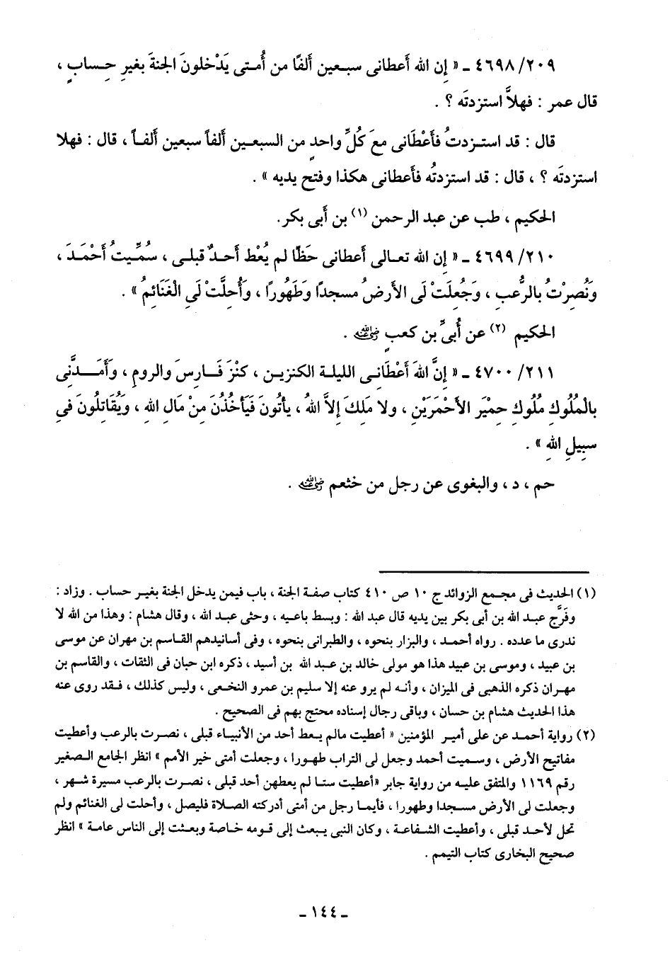 209/ 4698 - "إِن الله أَعطانى سبعين ألفًا من أُمتى يَدْخلونَ الجنةَ بغيرِ حِسابٍ، قال عمر: فهلَّا استزدتَه؟ .