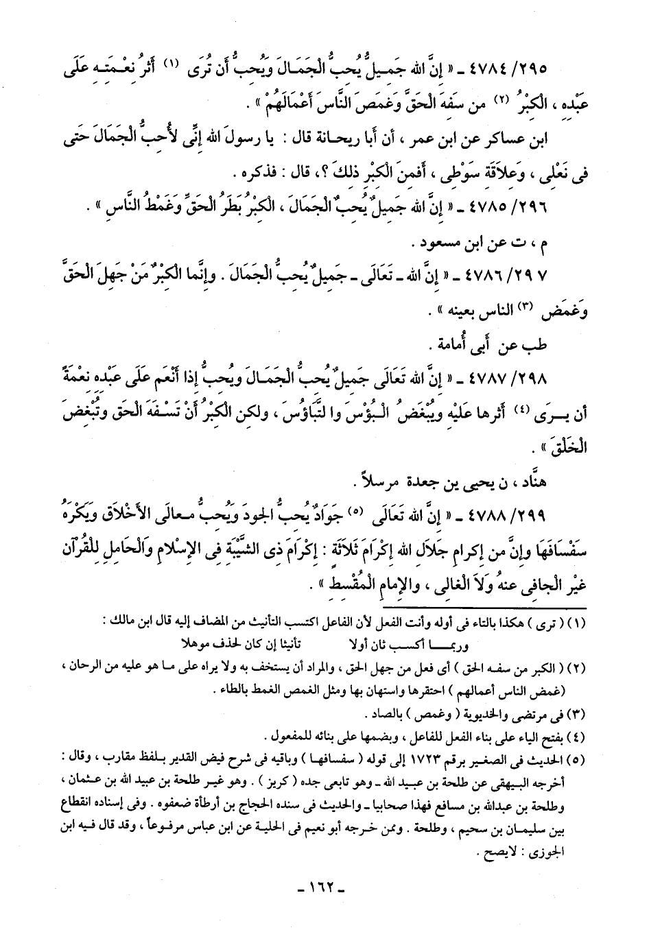 295/ 4784 - "إِنَّ الله جَمِيلٌ يُحِبُّ الْجَمَال وَيُحِبُّ أَن تُرَى (¬1) أثرُ نِعْمَتِهِ عَلَى عَبْدِهِ، الْكِبْرُ (¬2) من سَفِهَ الْحَقَّ وَغمَصَ النَّاسَ أعْمَالهُمْ".