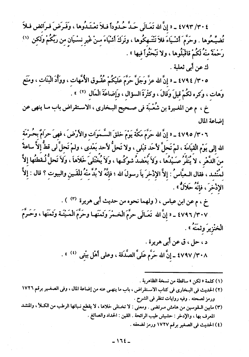 305/ 4794 - "إِنَّ الله عزَّ وَجَلَّ حَرَّمَ عَليكمْ عُقُوق الأُمَّهاتِ، ووَأُدَ الْبَنَاتِ، ومَنَعَ وَهاتِ، وَكَره لكُمْ قِيلَ وَقال، وكثْرَةَ السؤالِ، وإضاعَةَ الْمَالِ (¬2) ".