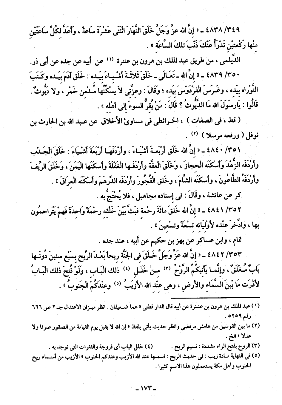 351/ 4840 - "إِنَّ الله خَلَق أَرْبَعةَ أشْيَاءَ، وأرْدَفَهَا أَرْبَعَةَ أَشْيَاءَ: خَلَقَ الْجَدْب وأرْدَفَه الزُّهْدَ وَأَسْكنَه الْحِجازَ، وَخَلَقَ الْعِفَّة وأَرْدَفَها الْغَفْلَةَ وأسكَنَها الْيَمَنَ، وَخَلَقَ الرِّيفَ وأرْدَفَهُ الطَّاعُونَ، وأسكَنَه الشَّامَ، وخَلق الْفُجُورَ وأرْدَفَه الدِّرهَمَ وأسكنَه الْعِرَاقَ".