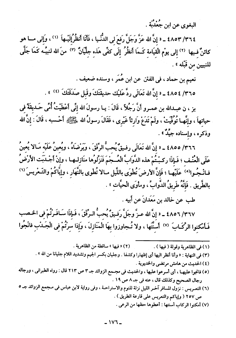 366/ 4855 - "إِنَّ الله تَعَالى رفيقٌ يُحبُّ الرِّفْقَ، وَيَرْضَاهُ، ويُعِينُ عَلَيهِ مَا لا يُعِينُ عَلَى الْعُنْف؛ فَإِذَا ركبْتُمْ هذه الدَّوَابَّ الْعُجمَ فَنَزِّلوُها منَازِلها، وإنْ أَجْدَبَت الأرْضُ فانْجُوا (¬5) عَلَيها؛ فَإنَّ الأرضَ تُطوَى باللَّيل ما لا تُطوى بالنَّهَارِ، وإِيَّاكُمْ والتّعْريسَ (¬6) بالطَّريق. فَإِنَّهُ طَرِيقُ الدَّوابِّ، ومأوَى الْحيَّاتِ".