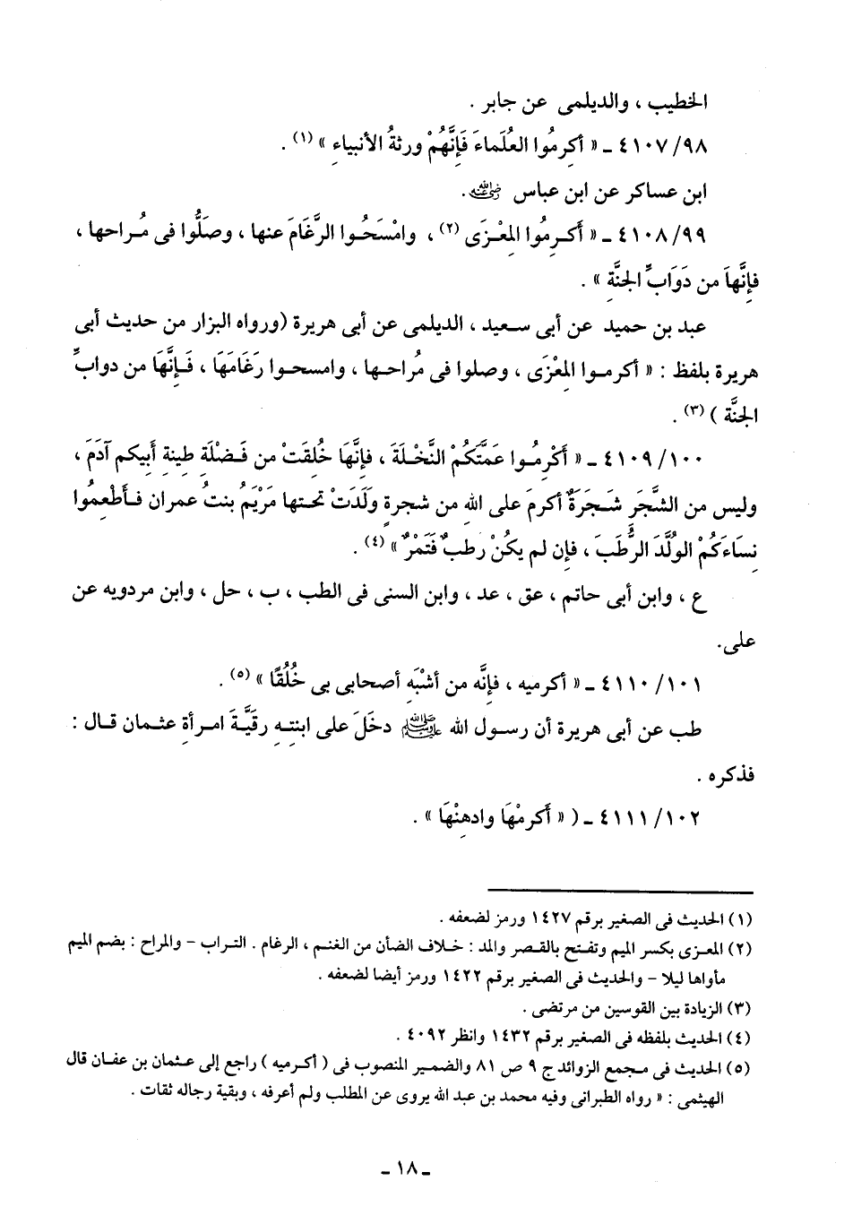 99/ 4108 - "أكرِمُوا المِعْزَى (¬2)، وامْسَحُوا الرَّغامَ عنها، وصَلُّوا في مُراحها، فإِنَّها من دَوَاب الجنةِ".