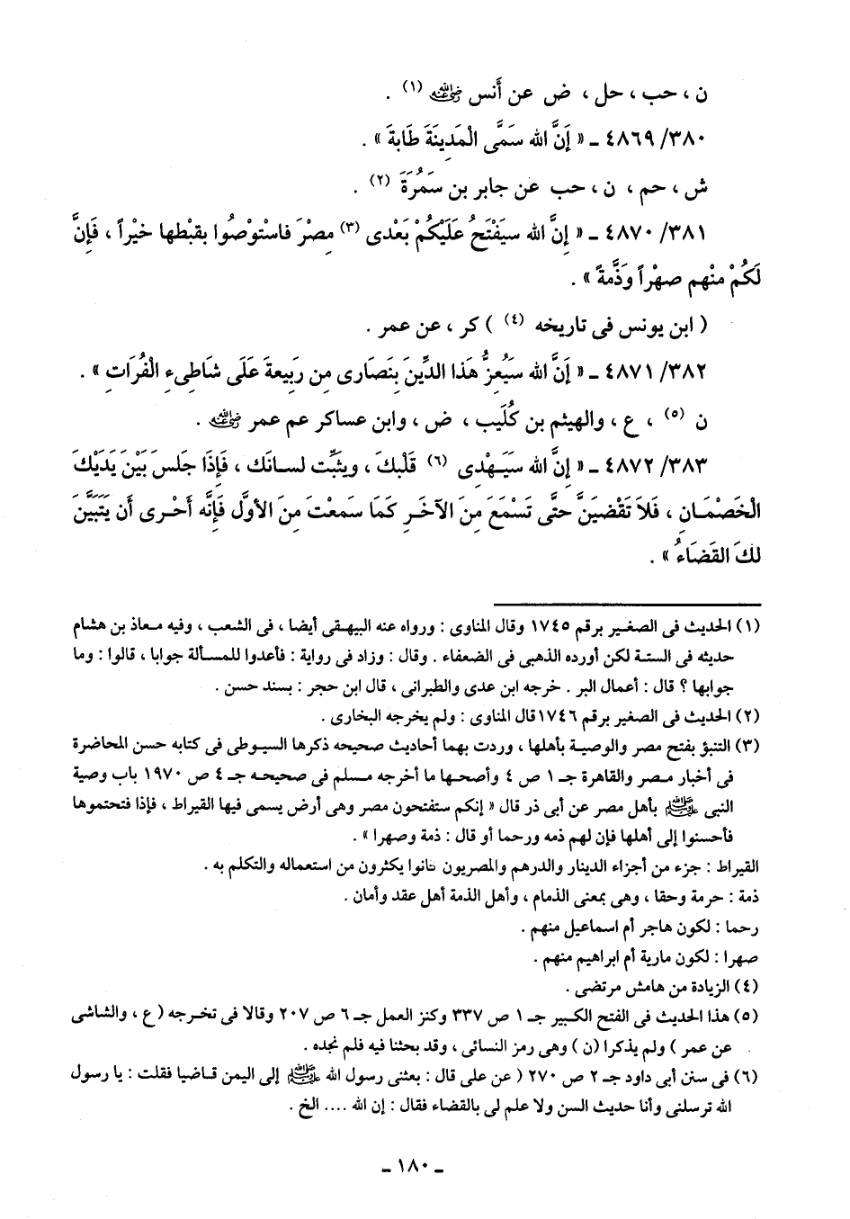 381/ 4870 - "إِنَّ الله سيَفْتَحُ عَلَيكمْ بَعْدى (¬3) مِصْرَ فاسْتوْصُوا بقبْطها خيرًا، فَإِنَّ لَكُمْ منْهم صهْرًا وَذَّمةً".