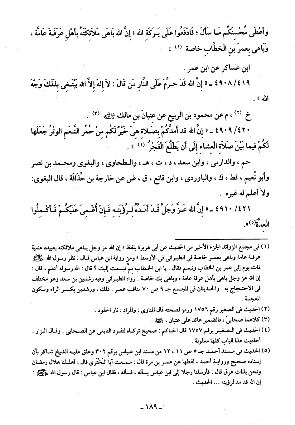 (¬1) في مجمع الزوائد الجزء الأخير من الحديث عن أبي هريرة بلفظ "إن الله عزَّ وجلَّ باهى ملائكته بعبيده عشية عرفة عامة وباهى بعمر خاصة في الطبراني في الأوسط" وفي رواية ابن عباس قال: نظر رسول الله - صلى الله عليه وسلم - ذات يوم إلى عمر بن الخطاب وتبسم فقال: يا ابن الخطاب مِمَّ تبسمت إليك؟ قال: الله رسوله أعلم، قال: إن الله عزَّ وجلَّ بأهل بأهل عرفة مامة، وباهى بك خاصة. روَاه الطبراني وفيه رشدين بن سعد وهو مختلف في الاحتجاج به. والحديثان في المجمع جـ 9 ص 70 مناقب عمر. ذلك، ورشدين بكسر الراء وسكون المعجمة.