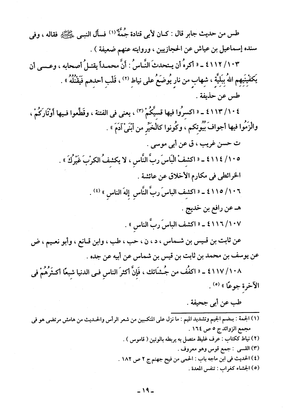 4117/ 108 - "اكفُف من جُشَائك، فَإنَّ أكثرَ الناسِ في الدنيا شبعًا أكثَرُهُمْ في الآخرةِ جوعًا" (¬5).
