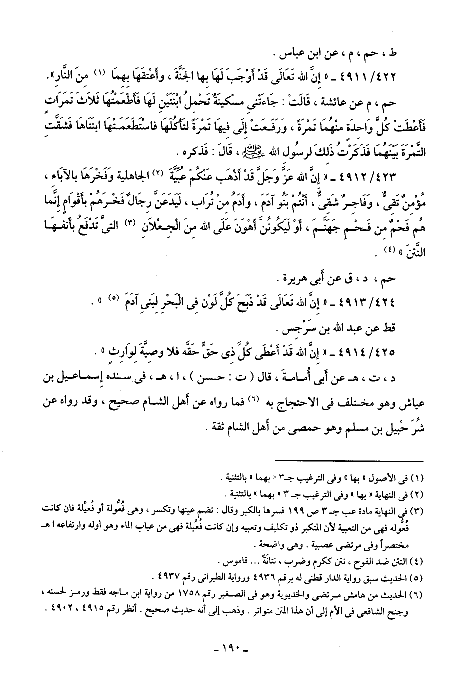 425/ 4914 - "إِنَّ الله قَدْ أَعْطَى كُلَّ ذِي حَقٍّ حَقَّه فلا وصيَّةَ لِوَارِثٍ".