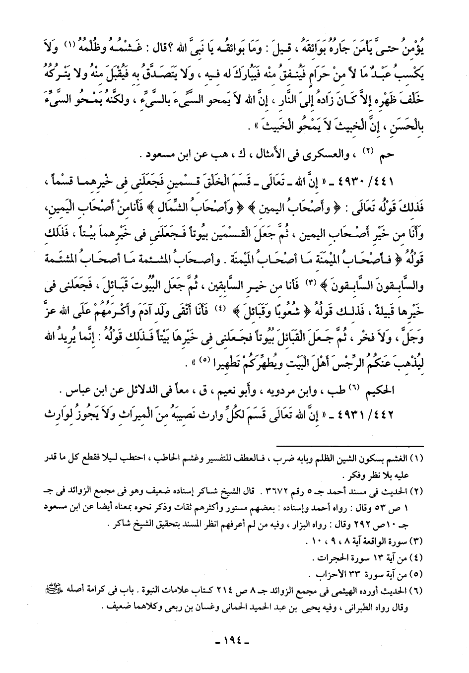 441/ 4930 - "إِنَّ الله -تَعَالى- قَسَمَ الْخَلقَ قِسْمينِ فَجَعَلَنِى فِي خْيرِهِما قسْمًا، فَذلِكَ قَوْلُه تَعَالى: {وَأَصْحَابُ الْيَمِينِ} {وَأَصْحَابُ الشِّمَالِ} فَأَنا مِنْ أصْحَاب الْيَمِينِ، وَأنَا مِن خَيرِ أصْحَابِ اليمين، ثُمَّ جَعَلَ الْقسْمَين بيُوتًا فَجَعَلَني في خَيرِهما بيتًا، فَذَلك قَوْلُهُ {فَأَصْحَابُ الْمَيمَنَةِ مَا أَصْحَابُ الْمَيمَنَةِ (8) وَأَصْحَابُ الْمَشْأَمَةِ مَا أَصْحَابُ الْمَشْأَمَةِ (9) وَالسَّابِقُونَ السَّابِقُونَ} (¬3) فَأنا مِن خيرِ السَّابِقِين، ثُمَّ جَعَل البُيُوتَ قَبَائِلَ، فَجَعَلنى في خَيرِها قَبيلةً، فَذلِك قَولُهُ {شُعُوبًا وَقَبَائِلَ} (¬4) فَأَنَا أَتْقَى وَلَد آدَمَ وأَكرَمُهُمْ عَلَى الله عزَّ وَجَلَّ، وَلَا فخْر، ثُمَّ جَعَلَ الْقَبَائِلَ بُيُوتًا فجَعَلنِي فِي خَيرِهَا بَيتًا فَذَلِك قَوْلُهُ. إِنَّما يُرِيدُ الله لِيُذْهِبَ عَنكُمُ الرِّجْسَ أهْلَ الْبَيتِ ويُطهِّرَكُمْ تَطهِيرا (¬5) ".