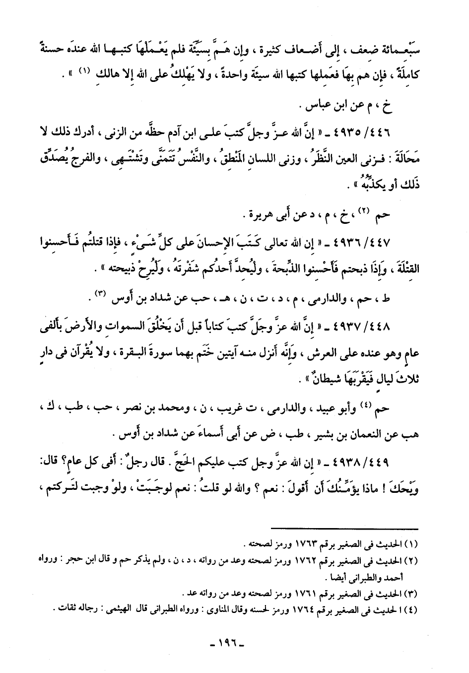 447/ 4936 - "إِن الله تعالى كَتَبَ الإِحسانَ على كل شَيء، فإِذا قتلتُم فَأحسِنوا القِتْلَةَ، وَإذَا ذبحتم فَأَحْسِنوا الذِّبحةَ، ولْيُحِدَّ أَحدُكم شَفْرتَهُ، وَلْيُرِحْ ذبيحته".