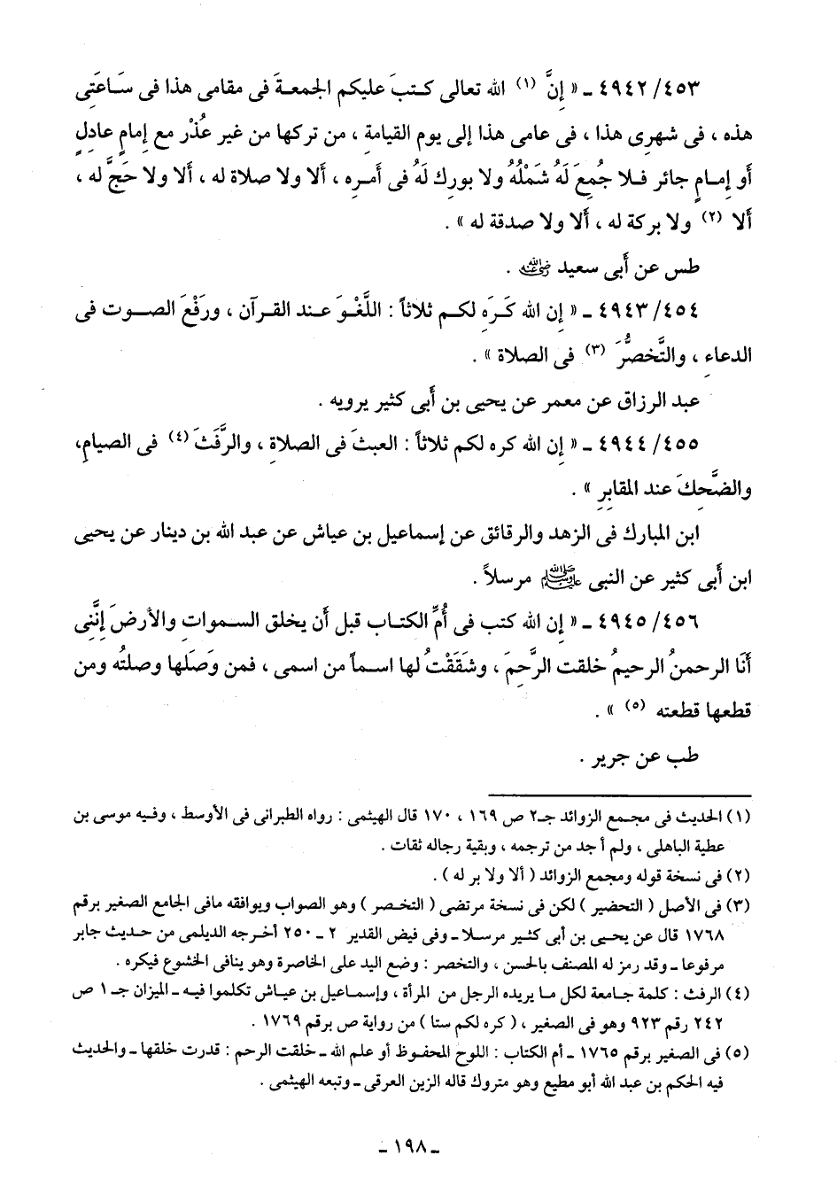 454/ 4943 - "إِن الله كَرَهِ لكم ثلاثًا: اللَّغْوَ عند القرآن، ورَفع الصوت في الدعاءِ، والتَّخصُّرَ (¬3) في الصلاة".