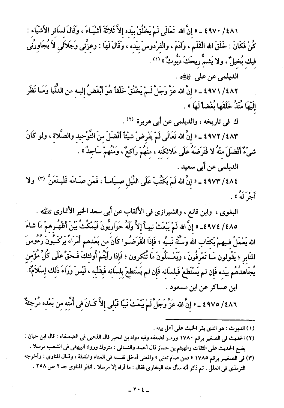 481/ 4970 - "إِنَّ الله تَعَالى لَمْ يَخْلُقْ بِيَدِه إلا ثَلاثَةَ أشْيَاءَ، وَقَال لِسَائِر الأشْيَاءِ: كُنْ فَكَانَ: خَلَقَ الله الْقَلَم، وآدَمَ، والْفِرْدوسَ بِيَدِه، وَقَال لَهَا: وعِزَّتِى وَجَلالي لَا يُجَاورُنى فِيكِ بخِيلٌ، ولا يَشمُّ رِيحَكَ دَيُّوثٌ" (¬1).