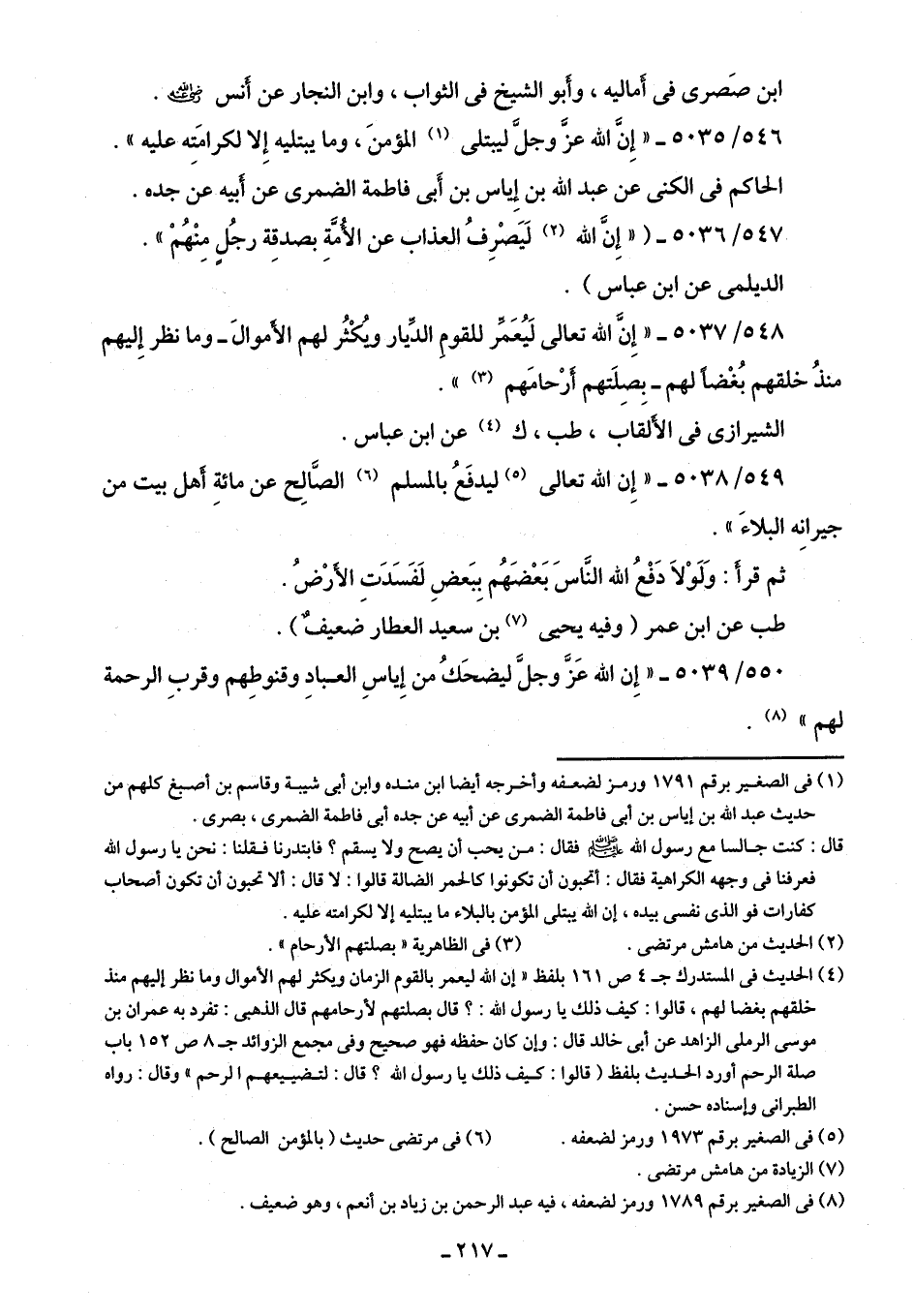 548/ 5037 - "إِنَّ الله تعالى لَيُعَمِّر للقومِ الدِّيار ويُكْثُر لهم الأَموال -وما نظر إِليهم منذُ خلقهم بُغْضًا لهم- بِصِلَتهم أَرْحامَهم (¬3) ".