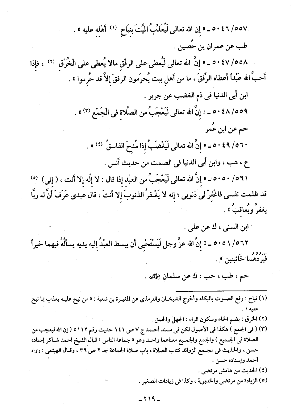 561/ 5050 - "إِنَّ الله تعالى لَيَعْجَبُ من العبْدِ إِذا قال: لا إِله إِلا أَنت، (إِنى) (¬5) قد ظلمت نفسي فاغْفِرْ لي ذنوبى؛ إِنه لا يَغْفرُ الذنوبَ إِلا أَنتَ، قال عبدى عَرَفَ أَنَّ له ربًّا يغفرُ ويُعاقِبُ".
