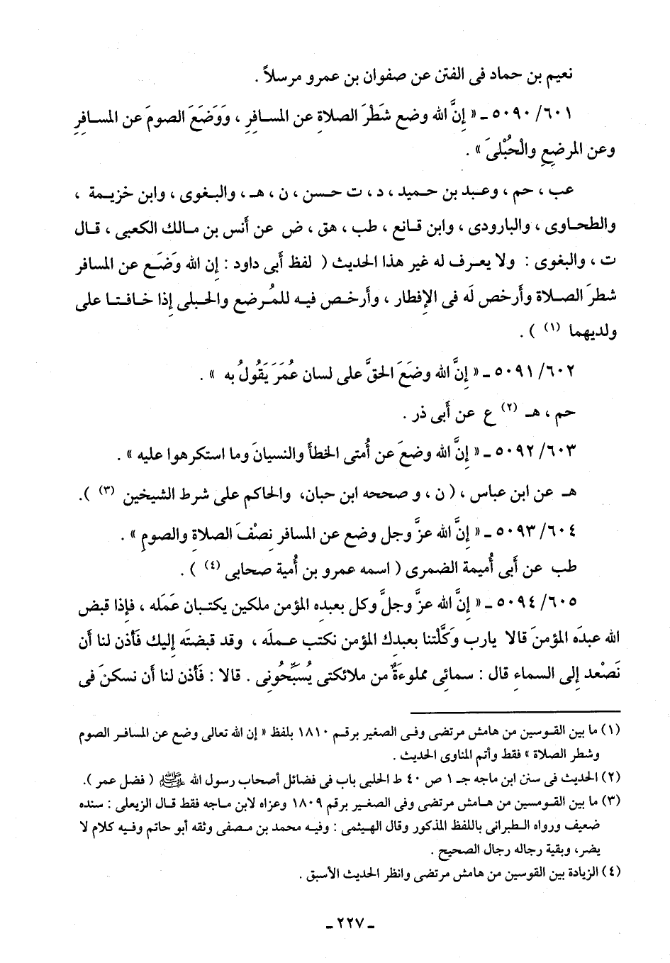 5093/ 604 - "إِنَّ الله عزَّ وجل وضع عن المسافر نِصْفَ الصلاةِ والصومِ".