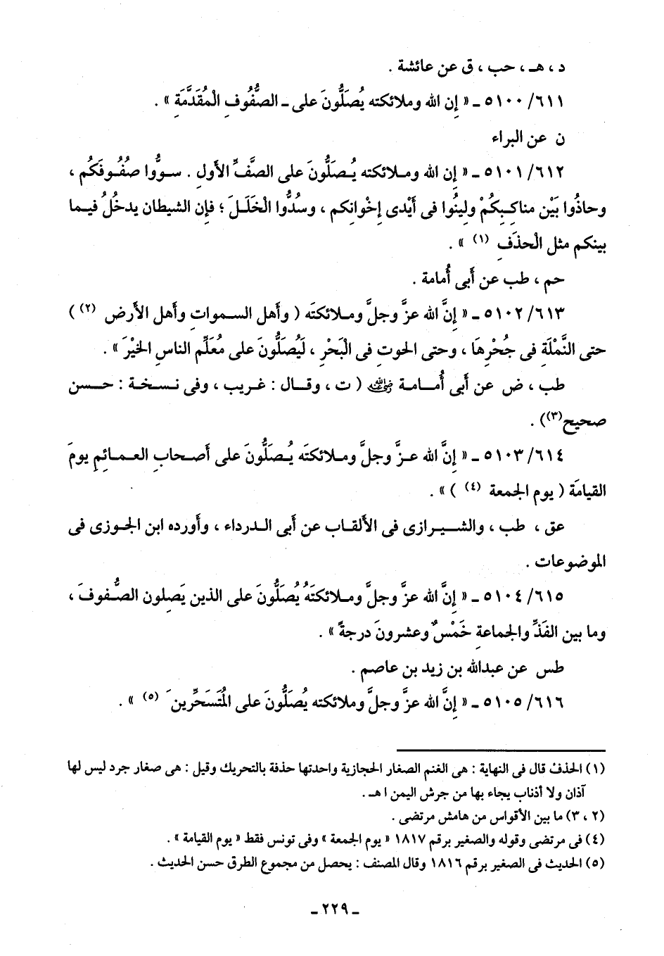 615/ 5104 - "إِنَّ الله عزَّ وجلَّ وملائكتَهُ يُصَلُّونَ على الذين يَصِلون الصُّفوفَ، وما بين الفَذِّ والجماعةِ خَمْسٌ وعشرونَ درجةً".