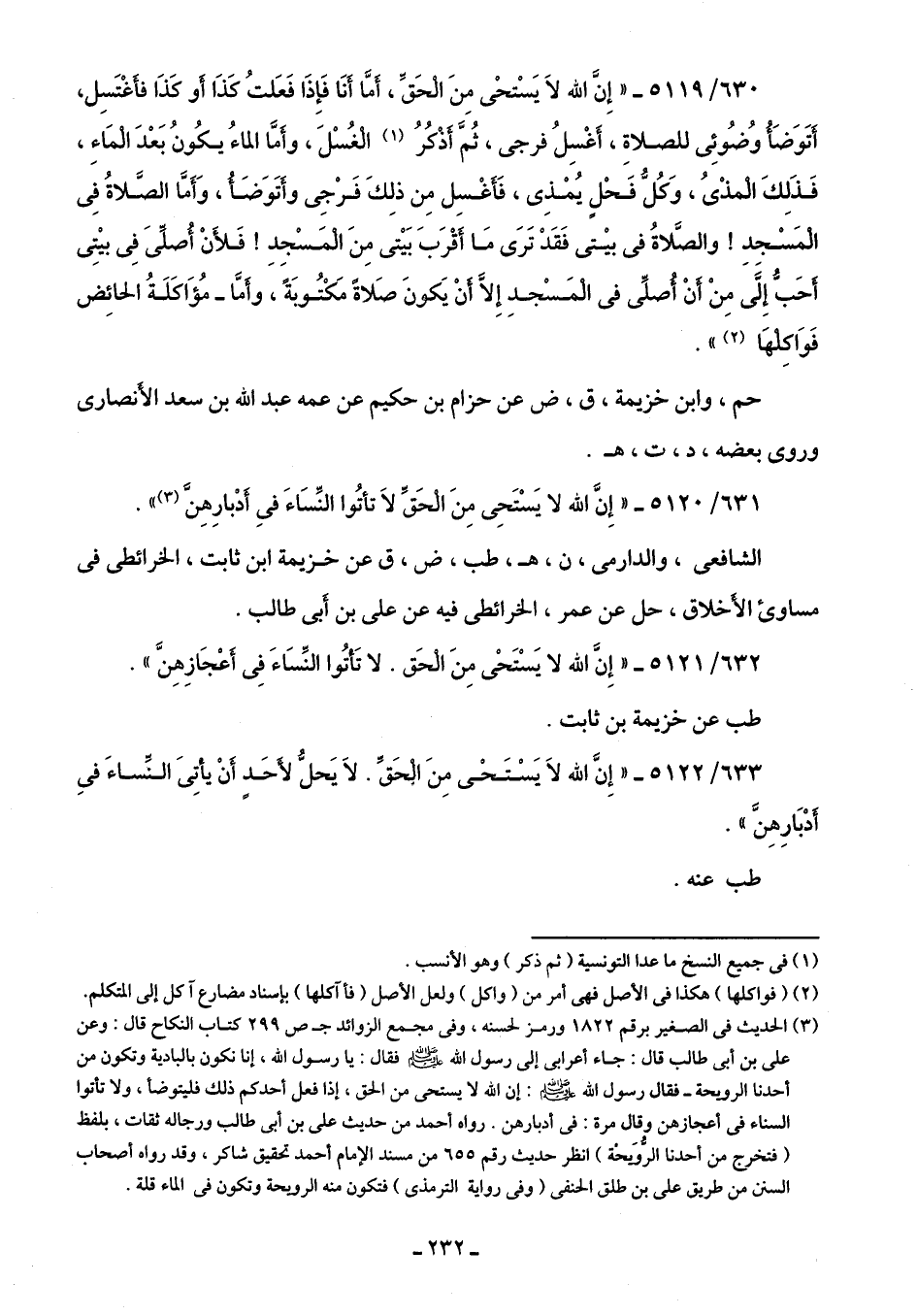 631/ 5120 - "إِنَّ الله لا يَسْتَحِى مِنَ الْحَقِّ لَا تأتُوا النِّسَاءَ في أَدْبارِهِنَّ (¬3) ".