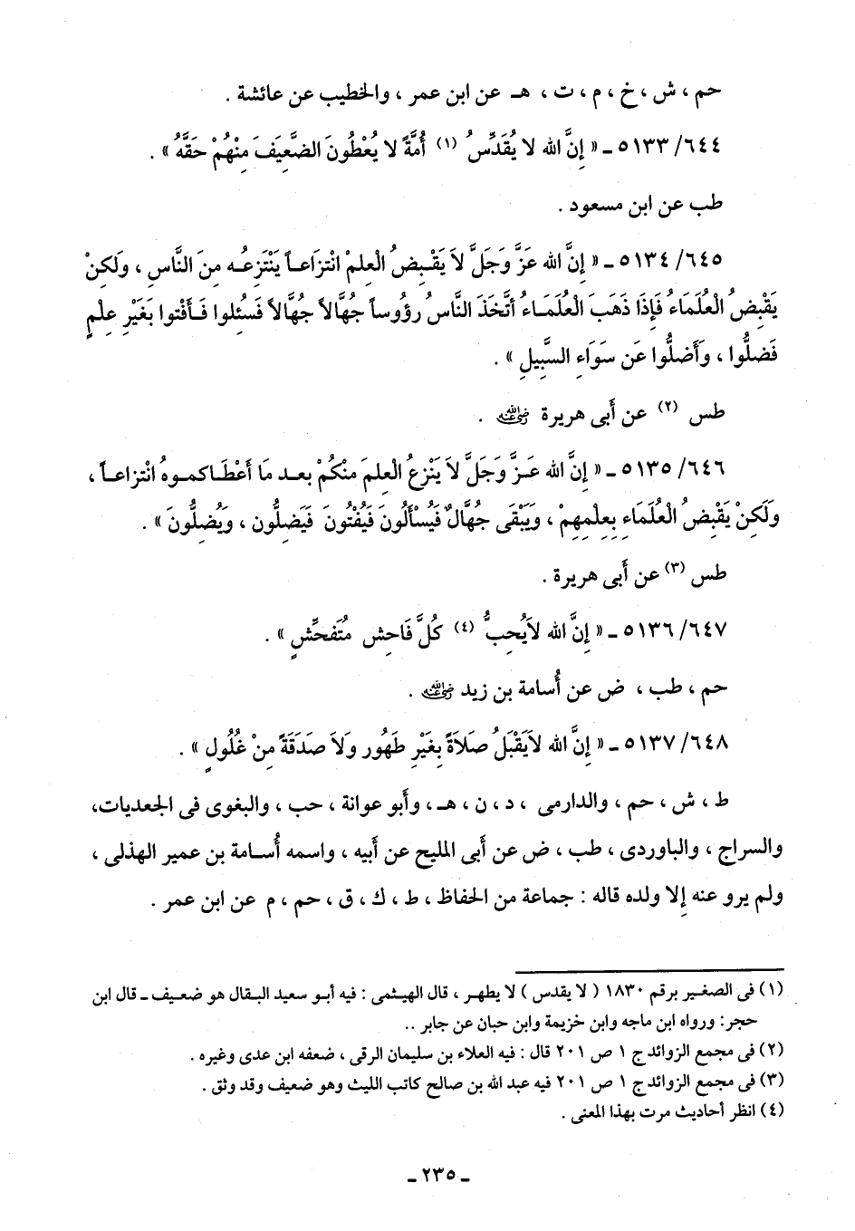 645/ 5134 - "إِنَّ الله عَزَّ وَجَلَّ لَا يَقْبِضُ الْعِلمَ انْتزَاعًا يَنْتَزِعُه مِنَ النَّاسِ، وَلكِنْ يَقْبِضُ الْعُلَمَاءُ فَإِذَا ذَهَبَ الْعُلَمَاءُ أتَّخَذَ النَّاسُ رؤُوسًا جُهَّالًا فَسُئِلوا فَأَفْتوا بَغَيرِ عِلْمٍ فَضلُّوا، وَأَضلُّوا عَن سَوَاءِ السَّبِيلِ".