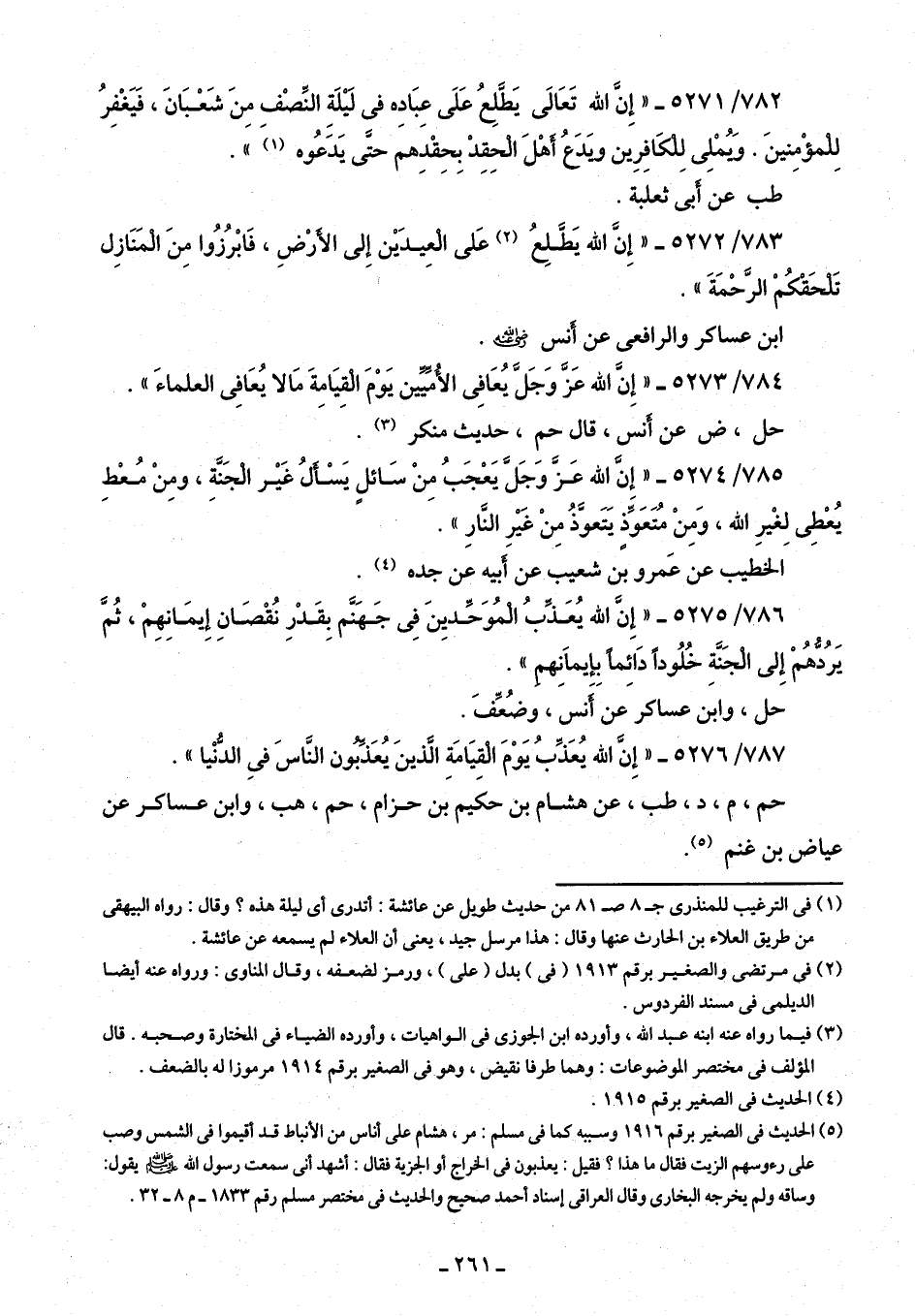 782/ 5271 - "إِنَّ الله تَعَالى يَطَّلِعُ عَلَى عِبَادِه في لَيلَةِ النِّصْف مِنَ شَعْبَانَ، فَيَغْفِرُ لِلمؤْمِنينَ. وَيُمْلِى لِلْكَافِرِين ويَدَعُ أهْلَ الْحِقِدْ بحقْدهم حتَّى يَدَعُوه (¬1) ".