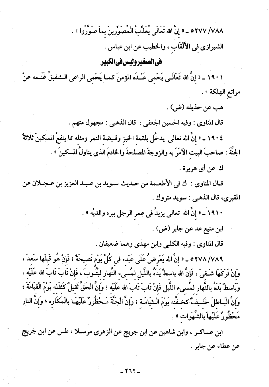 789/ 5278 - "إِنَّ الله يَعْرِضُ عَلَى عَبْدِه في كُلِّ يَوْمٍ نَصِيحَةً؛ فَإِنْ هُو قَبِلَها سَعِدَ، وَإنْ تَرَكهَا شَقِيَ، فَإِنَّ الله باسطٌ يَدَهُ باللَّيلِ لِمُسِئِ النَّهارِ لِيَتُوبَ، فَإِنْ تَابَ تَابَ الله عَلَيهِ، وَبَاسط يَدَهُ بالنَّهارِ لِمُسِئ اللَّيَل فَإنْ تَابَ تَابَ الله عَلَيه؛ وَإنَّ الْحَقَّ ثَقِيلٌ كَثقَله يَوْمَ الْقِيَامَةَ؛ وَإنَّ الْبَاطِلَ خَفِيفٌ كخِفَّتِه يَوْمَ الْقِيَامَةِ؛ وَإنَّ الْجَنَّةَ مَحْظُورٌ عَلَيهَا بالْمَكَارَه؛ وَإِنَّ النار مَحْظُورٌ عَلَيها بالشَّهَواتِ".