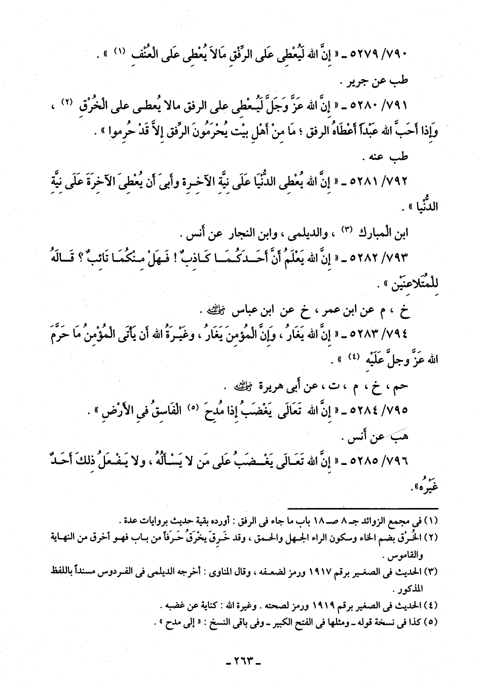 791/ 5280 - "إِنَّ الله عَزَّ وَجَلَّ لَيُعْطِى على الرفق ما لا يُعطى على الْخُرْقِ (¬2)، وَإِذا أحَبَّ الله عَبْدًا أعْطَاهُ الرفق؛ مَا مِنْ أهْلِ بيت يُحْرَمُونَ الرِّفق إِلَّا قَدْ حُرِموا".