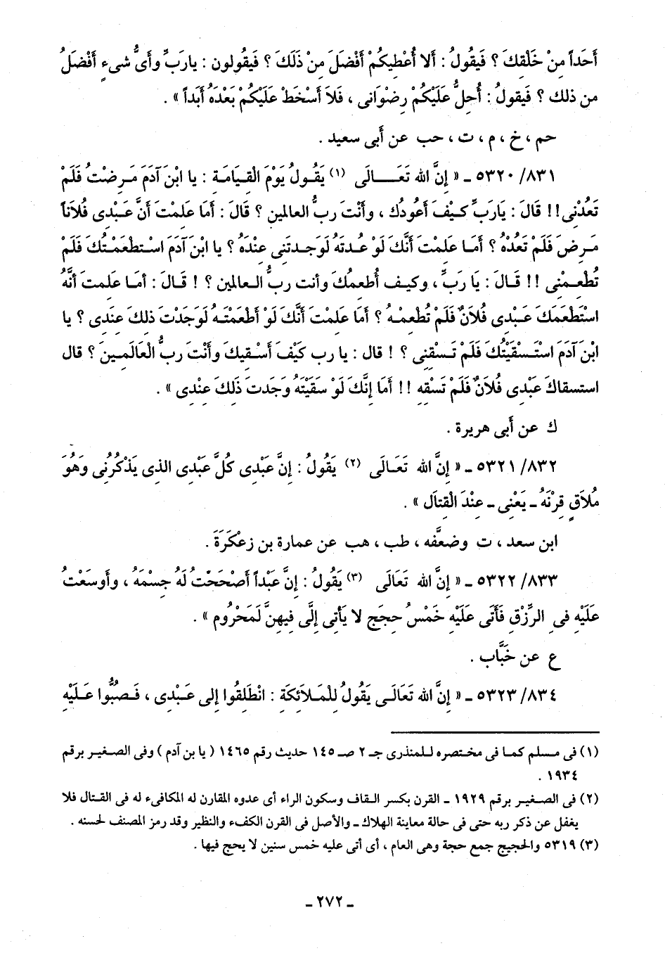 831/ 5320 - "إِن الله تَعَالى (¬1) يَقولُ يَوْمَ القِيَامَة: يا ابْنَ آدَمَ مَرِضْتُ فَلَمْ تَعُدْنِى! ! قَال: يَارَب كيفَ أعُودُك، وأنتَ رب العالميني؟ قَال: أَمَا عَلِمْتَ أن عَبْدى فُلانًا مَرِضَ فَلَمْ تَعُدْهُ؟ أمَّا عَلمْتَ أنَّكَ لَوْ عُدتَهُ لَوَجدتَنِى عِنْدَهُ؟ يا ابْنَ آدَمَ اسْتطعَمتُكَ فَلَمْ تُطعمْنِى! ! قَال: يَا رَب، وكيف أطعِمُكَ وأنت ربّ العالمين؟ ! قَال: أمَّا عَلِمتَ أنهُ اسْتَطَعَمَكَ عَبْدِي فُلانٌ فَلَمْ تُطعِمْهُ؛ أمَّا عَلِمْتَ أنَّكَ لَوْ أطعَمْتَهُ لَوَجَدْتَ ذلكَ عِنَدِى؟ يا ابْنَ آدَمَ اسْتَسْقَيتُكَ فَلَمْ تَسْقِنِى؟ ! قال: يا رب كيفَ أسْقِيكَ وأنْتَ رب العَالمِينَ؟ قال استسقاكَ عَبْدِي فُلانٌ فَلَمْ تَسْقِهِ! ! أَمَا إِنكَ لَوْ سَقَيتَهُ وَجَدتَ ذَلِكَ عِنْدِي".