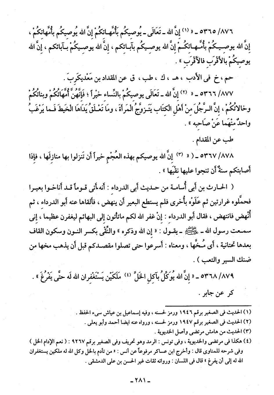 876/ 5365 - " (¬1) إِنَّ الله -تَعَالى- يُوصيكُم بَأمهاتكُمْ إِن الله يُوصِيكُم بأمَّهاتِكُمْ، إِن الله يوصِيكُمْ بأمَّهاتِكُمْ إِن الله يوصِيكُم بآبَائِكم، إِن الله يوصِيكُمْ بآبائكم، إِنَّ الله يوصِيكُمْ بالأقْرَبِ فالأقْرَبِ".