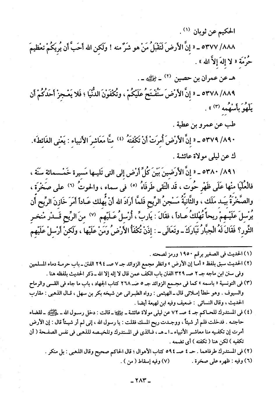 (¬2) الحديث سبق بلفظ "أما إن الأرض" وانظر مجمع الزوائد جـ 7 صـ 294 الفتن- باب حرمة دماء المسلمين وفي سنن ابن ماجه جـ 2 صـ 329 الفتن باب الكف عمن قال لا إله إلا الله- ذكر الحديث بلفظه هنا.