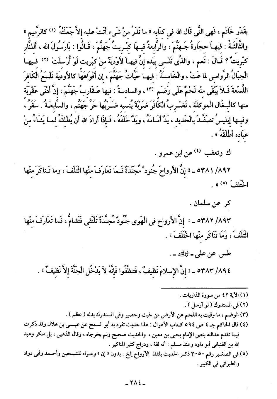 892/ 5381 - "إِنَّ الأرواحَ جُنود مُجندَة فَمَا تَعَارَفَ مِنْها ائْتَلَفَ، وما تَناكَرَ مِنْها اخْتَلفَ (¬5) ".