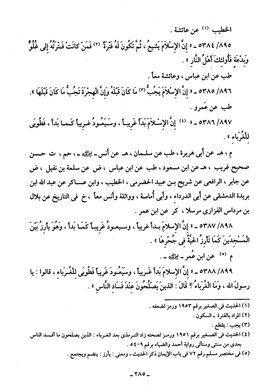 897/ 5386 - " (¬4) إِن الإسْلامَ بَدَأ غَرِيبًا، وسَيَعُودُ غرِيبًا كما بَدأ، فَطُوبَى لِلغُرَباءِ".