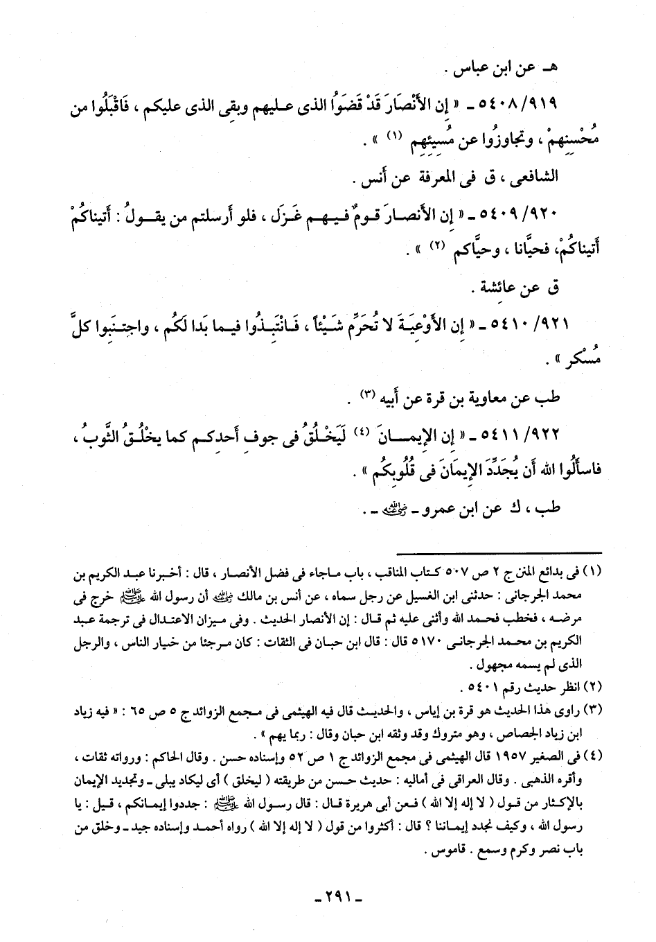 919/ 5408 - "إِن الأنْصَارَ قَدْ قَضَوُا الذي عليهم وبقِى الذي عليكم، فَاقْبَلُوا من مُحْسِنِهمْ، وتجاوزُوا عن مُسِيئِهِم (¬1) ".