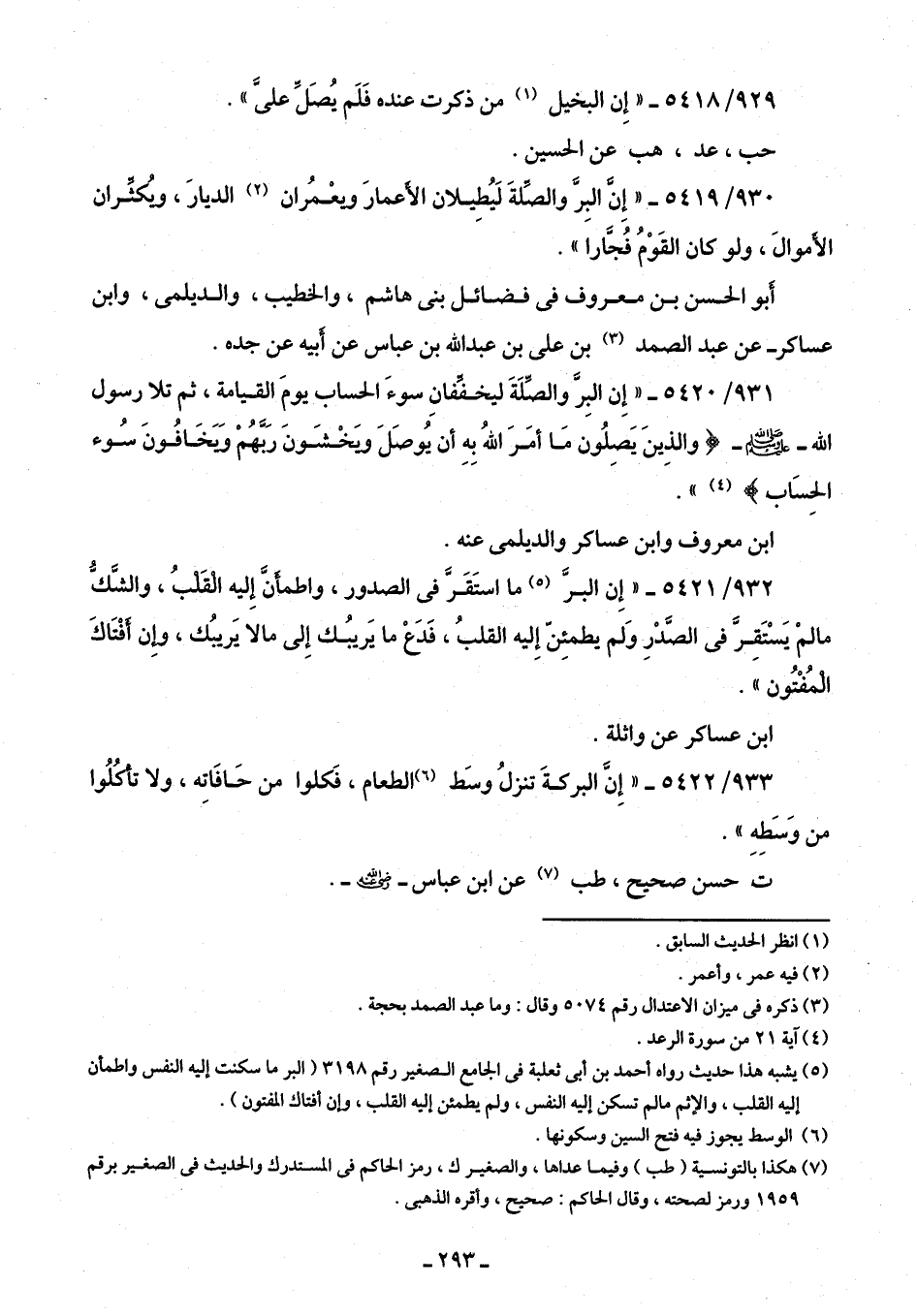 931/ 5420 - "إِن البِرَّ والصِّلَةَ ليخفِّفانِ سوءَ الحساب يومَ القيامة، ثم تلا رسول الله - صلى الله عليه وسلم - {وَالَّذِينَ يَصِلُونَ مَا أَمَرَ اللَّهُ بِهِ أَنْ يُوصَلَ وَيَخْشَوْنَ رَبَّهُمْ وَيَخَافُونَ سُوءَ الْحِسَابِ} (¬4) ".