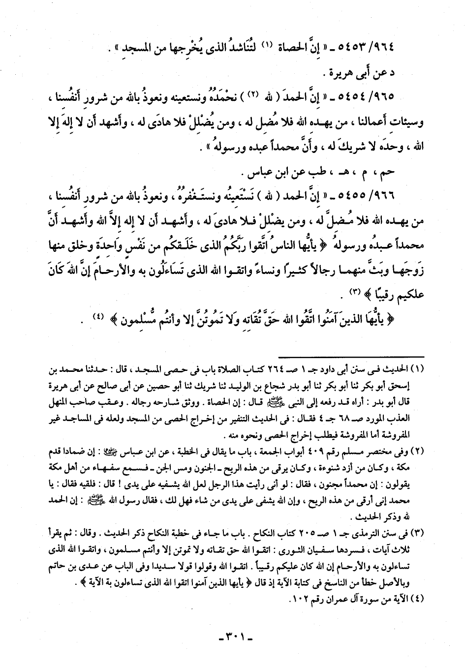 965/ 5454 - "إِنَّ الحمدَ (لله) (¬2) نحْمَدُهُ ونستعينه ونعوذُ بالله من شرورِ أنفُسِنا، وسيئاتِ أعمالنا، من يهده الله فلا مُضِل له، ومن يُضْلِلْ فلا هادَى له، واشهد أن لا إِلهَ إِلا الله، وحدَه لا شريكَ له، وأَنَّ محمدًا عبده ورسولهُ".