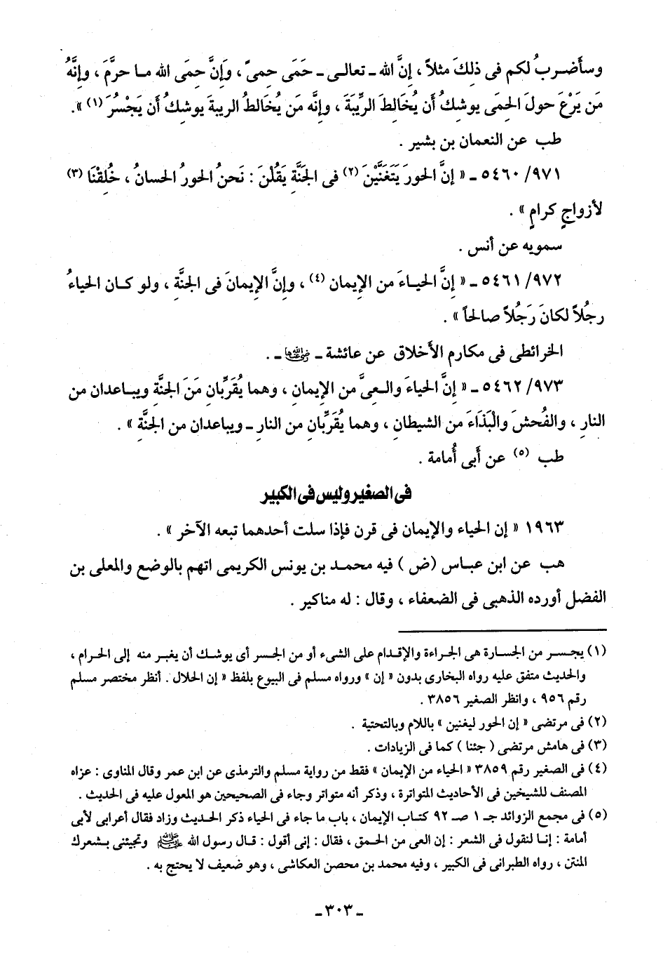 (¬4) فِي الصغير رقم 3859 "الحياء من الإيمان، فقط من رواية مسلم والترمذي عن ابن عمر وقال المناوى: عزاه المصنف للشيخين فِي الأحاديث المتواترة، وذكر أنَّه متواتر وجاء فِي الصحيحين هو المعول عليه فِي الحديث.