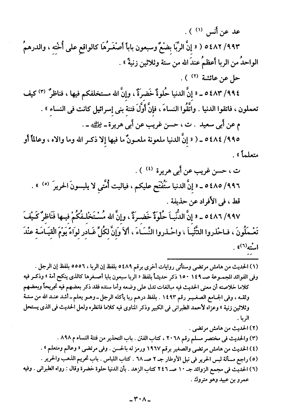 996/ 5485 - "إِنَّ الدنيا سَتُفْتَح عليكم، فيا ليت أُمَّتي لا يلبسونَ الحريرَ (¬5) ".