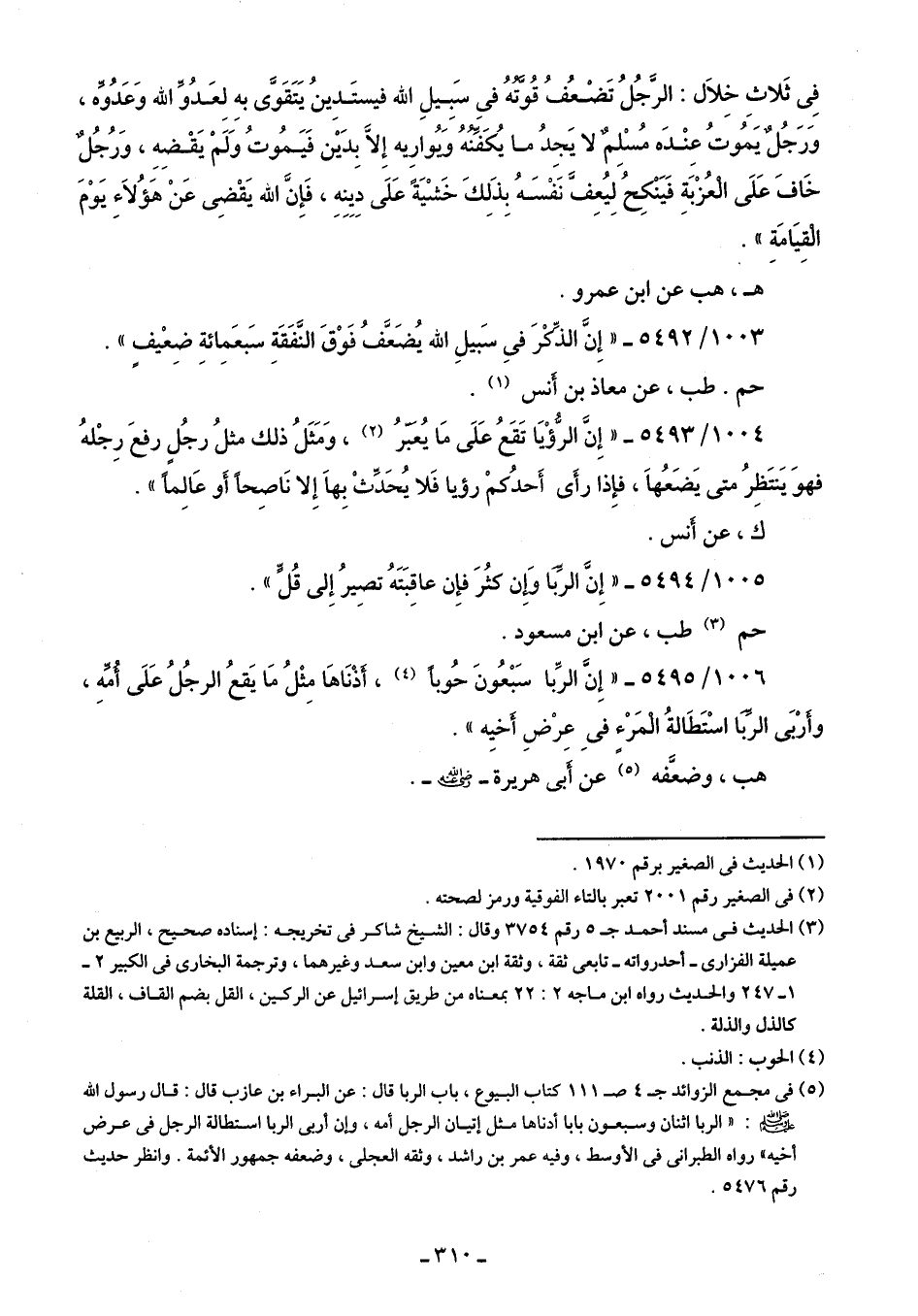 1006/ 5495 - "إِنَّ الرِّبا سَبْعُونَ حُوبًا (¬4)، أذنَاهَا مِثلُ مَا يَقعُ الرجُلُ عَلَى أُمِّهِ، وأرْبَى الربا اسْتَطَالةُ الْمَرْء فِي عِرْضِ أخيِه".