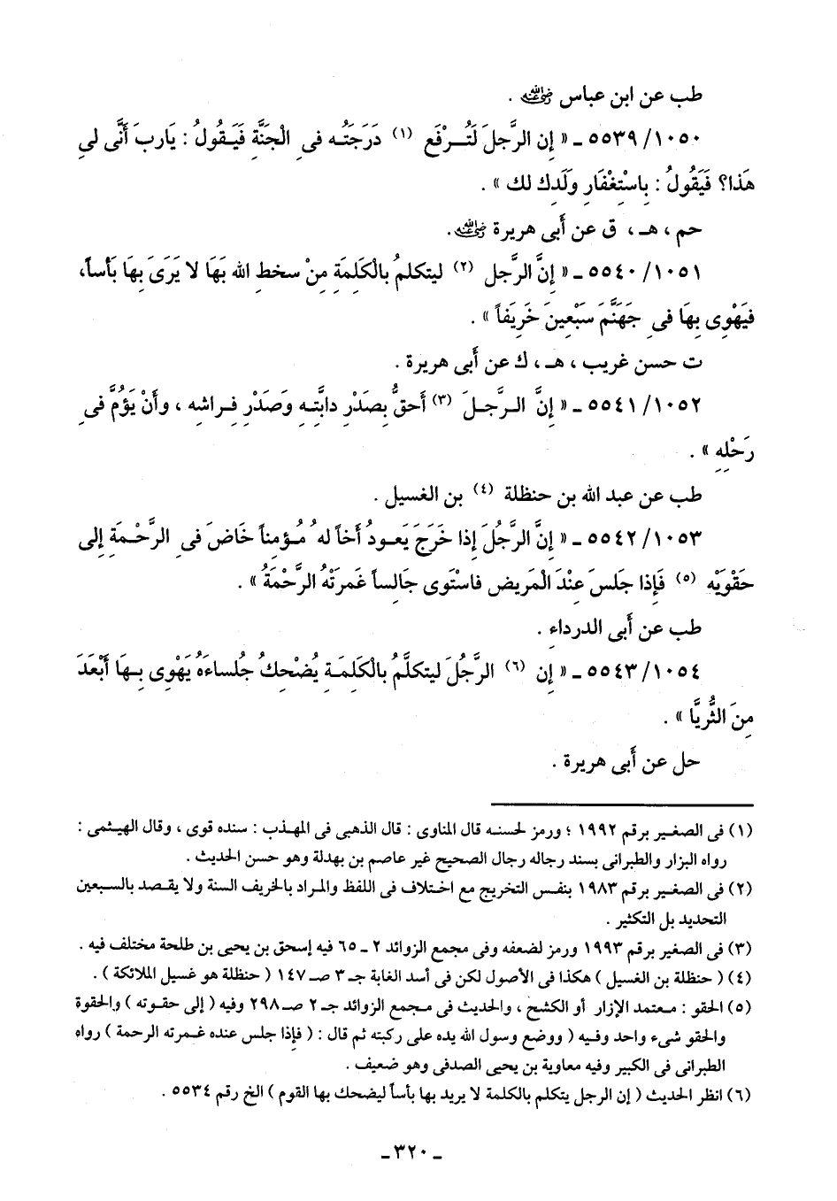 1051/ 5540 - "إِنَّ الرَّجُل (¬2) ليتكلمُ بالكَلِمَةِ مِنْ سخطِ الله بَهَا لا يَرَى بِهَا بَأسًا، فيَهْوى بِهَا فِي جَهَنَّمَ سَبْعِينَ خَرِيَفًا".