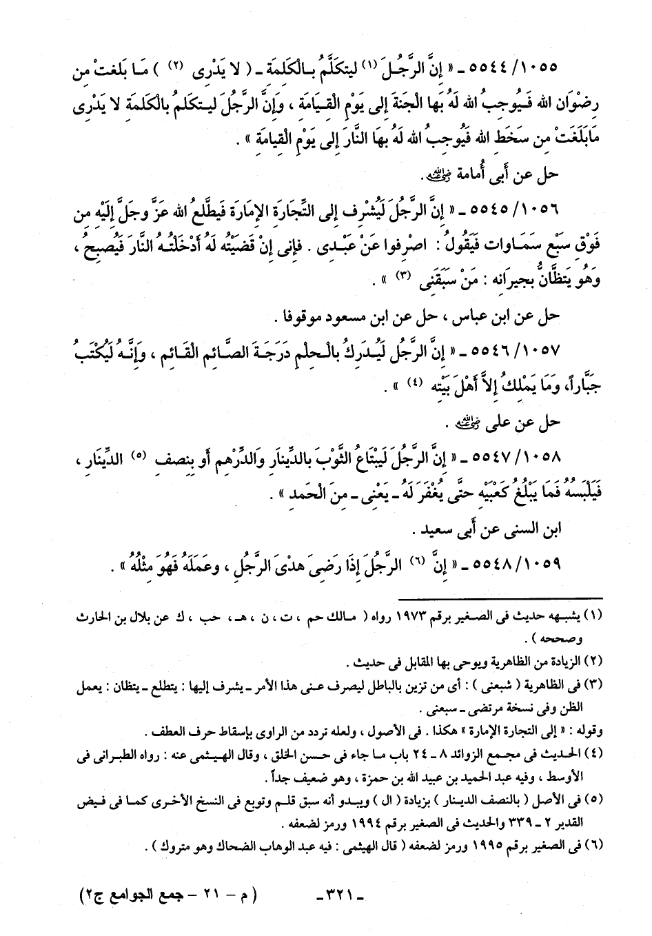 1055/ 5544 - "إِنَّ الرَّجُلَ (¬1) ليتكَلَّمُ بالْكَلِمَةِ - (لا يَدْرِي) (¬2) مَا بَلغتْ مِن رِضْوَان الله فَيُوجِبُ الله لَهُ بَها الْجَنَّةَ إِلى يَوْمِ الْقِيَامَةِ، وَإِنَّ الرَّجُلَ ليتكَلمُ بالْكَلِمَةِ لا يَدْرِي مَا بَلَغَتْ مِن سَخَطِ الله فَيُوجِبُ الله لَهُ بها النَّارَ إِلى يَوْمِ الْقِيامَةِ".