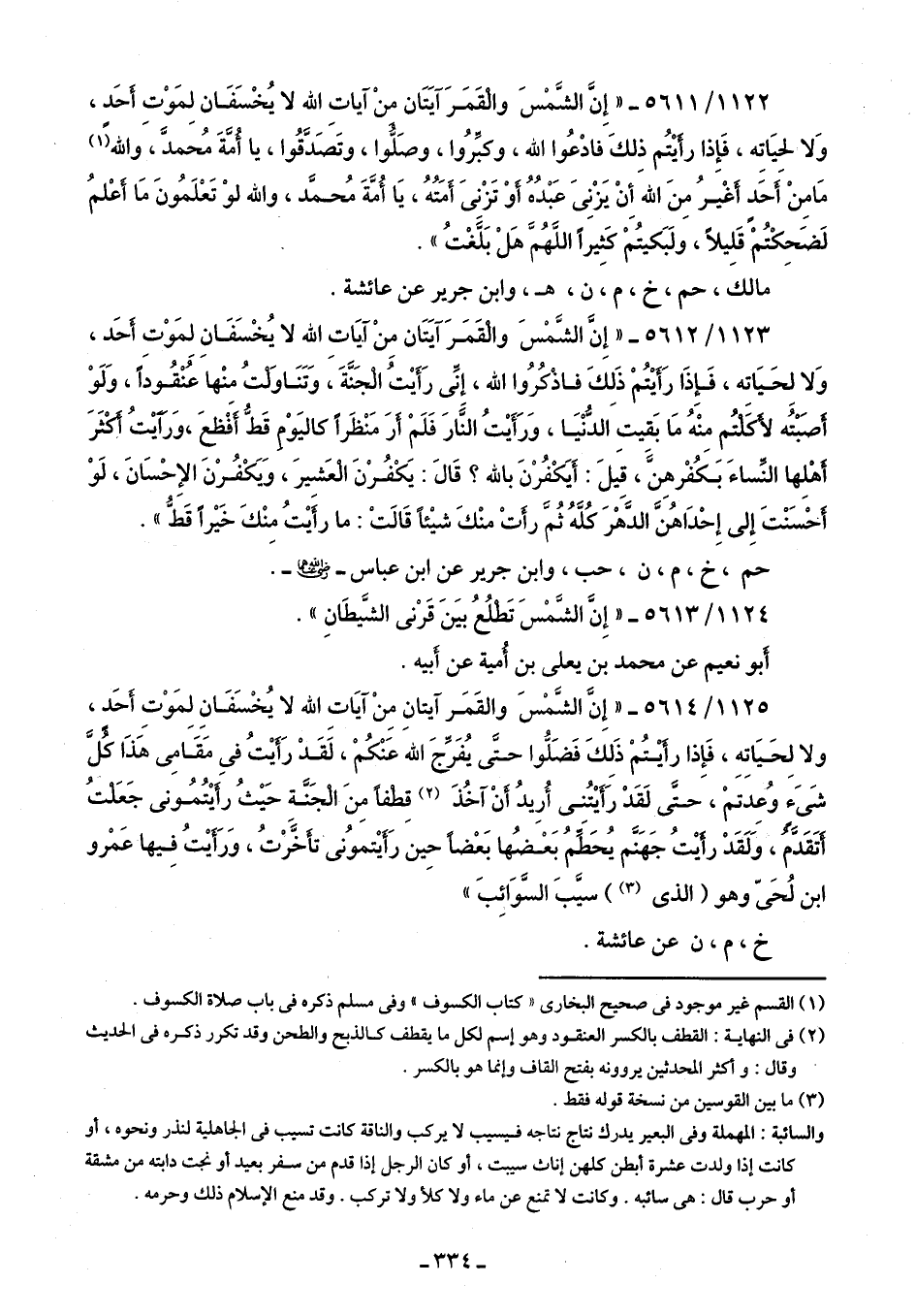 1123/ 5612 - "إِنَّ الشَّمْسَ والْقَمَرَ آيَتَان مِنْ آيَات الله لا يُخْسَفَانِ لِمَوْتِ أَحَد، وَلا لِحَيَاته، فَإِذَا رَأَيتُمْ ذَلِكَ فاذْكُرُوا الله، إنِّي رَأَيتُ الْجَنَّةَ، وَتَنَاوَلْتُ منْها عُنْقُودًا، وَلَوْ أصَبْتُه لأَكَلْتُم منْهُ مَا بَقيتِ الدُّنْيَا، وَرَأَيتُ النَّارَ فَلَمْ أَرَ مَنْظَرًا كاليَوْمِ قَطُّ أَفْظعَ، وَرأَيتُ أَكثَرَ أَهْلِها النِّساءَ بَكُفْرهِن، قيلَ: أَيَكْفُرْنَ بالله؟ قَال: يَكْفُرْنَ الْعَشيرَ، وَيَكْفُرْنَ الإِحْسَانَ، لَوْ أَحْسَنْتَ إِلى إِحْدَاهُنَّ الدَّهرَ كُلَّهُ ثُمَّ رأَتْ منْكَ شيئًا قَالتْ: ما رأَيتُ مِنْكَ خَيرًا قَطُّ".