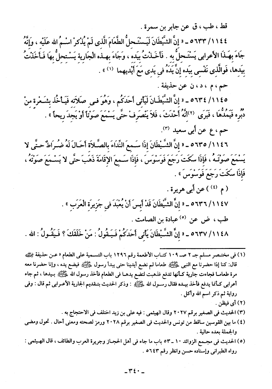 1144/ 5633 - "إِنَّ الشَّيطَانَ لَيَسْتَحِلُّ الطَّعَامَ الَّذِي لَمْ يُذْكرْ اسْمُ الله عَلَيه، وإِنَّهُ جَاءَ بِهَذَا الأَعرابى يَسْتَحِلُّ بِهِ. فَأَخَذْتُ بِيَده، وَجَاءَ بِهذه الْجَارِيةِ يَسْتِحِلُّ بِهَا فَأَخَذْتُ بِيَدِها، فَوالَّذِى نَفْسِى بِيَدِه إِنَّ يَدَهُ في يَدِي مَعَ أَيديهما (¬1) ".