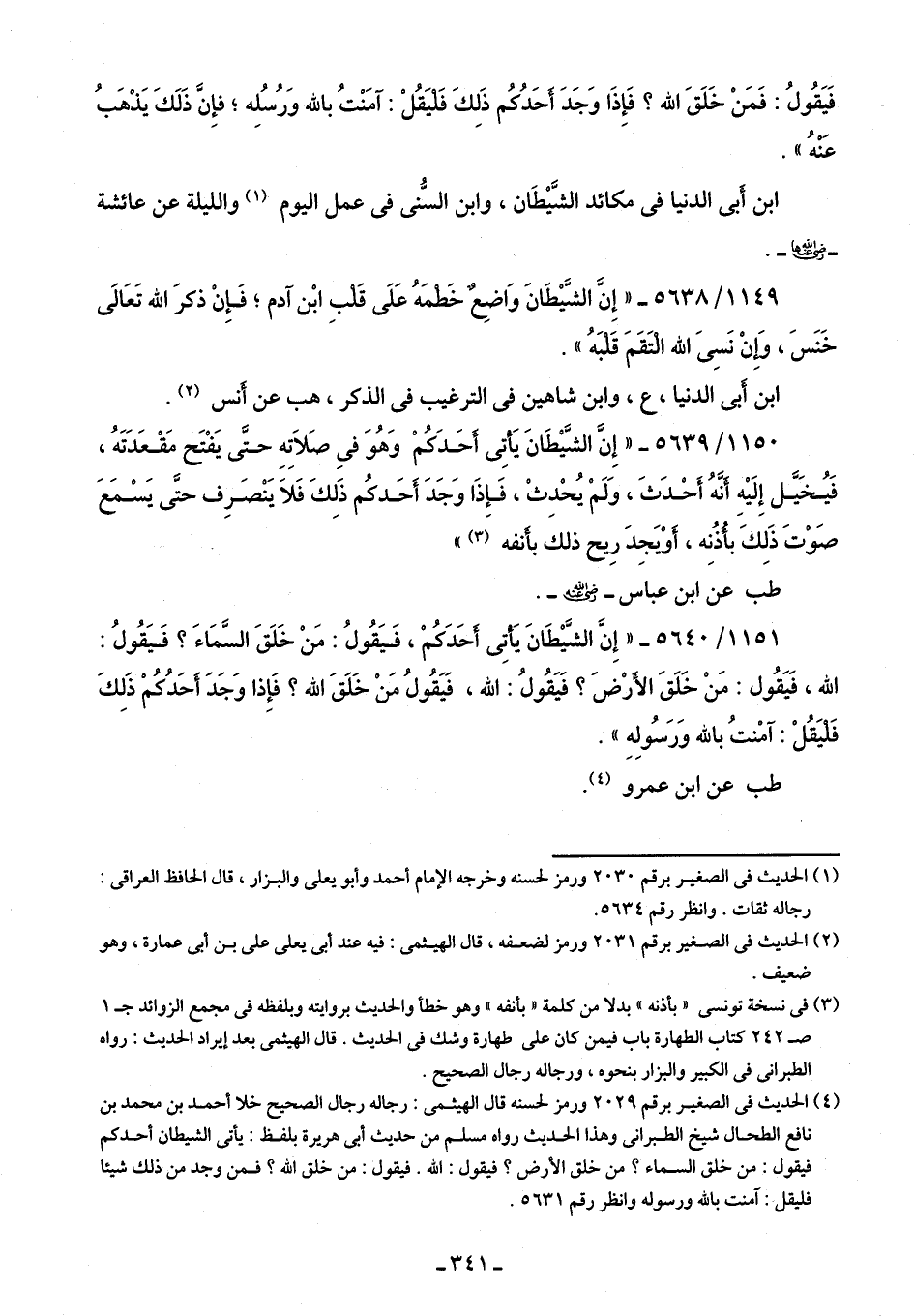 1151/ 5640 - "إِنَّ الشَّيطَانَ يَأْتِي أَحَدَكُمْ، فَيَقُولُ: مَنْ خَلَقَ السَّمَاءَ؟ فَيَقُولُ: الله، فَيَقُول: مَنْ خَلَقَ الأَرْضَ؟ فَيَقُولُ: الله، فَيَقُولُ مَنْ خَلَقَ الله؟ فَإِذا وَجَدَ أَحَدُكُمْ ذَلِكَ فَليَقُلْ: آمْنتُ بالله وَرَسُولِهِ".