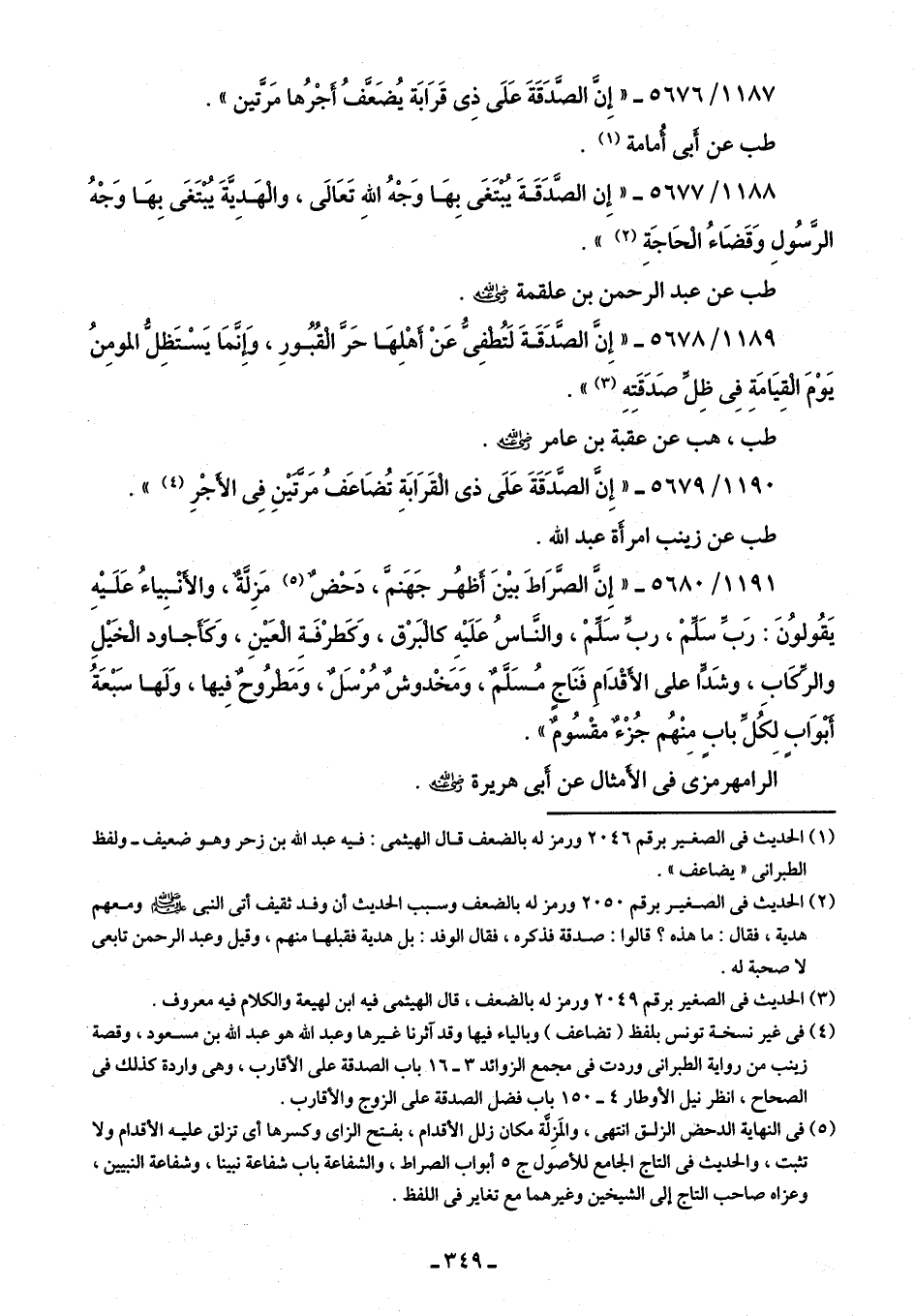 1189/ 5678 - "إِنَّ الصَّدَقَةَ لَتُطفِيُّ عَنْ أَهْلِهَا حَرَّ الْقُبُورِ، وَإنَّمَا يَسْتَظِلُّ المومِنُ يَوْمَ الْقِيَامَةِ في ظِلِّ صَدَقَتِهِ (¬3) ".