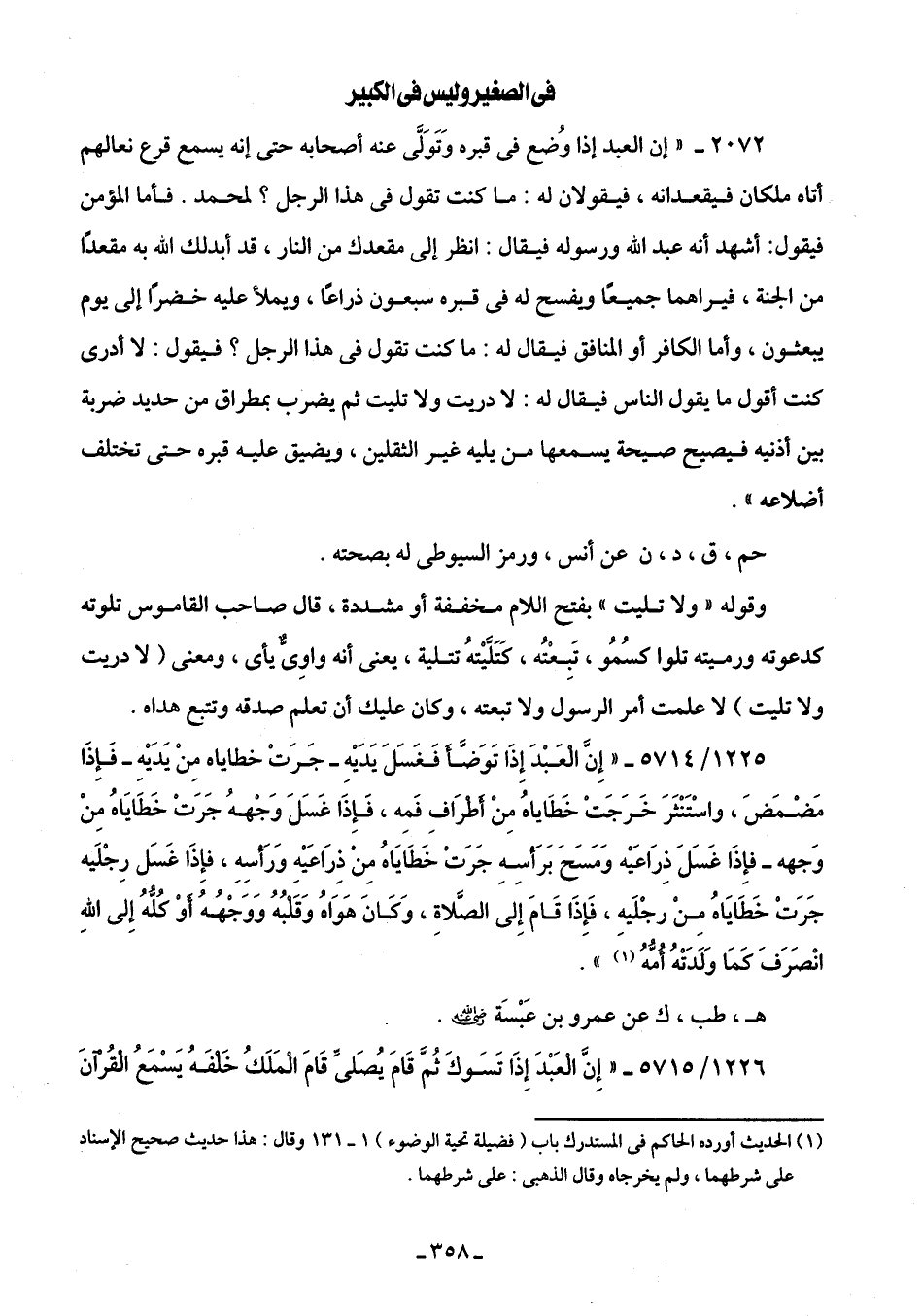 2072 - " إن العبد إذا وُضع في قبره وَتَوَلَّى عنه أصحابه حتى إنه يسمع قرع نعالهم أتاه ملكان فيقعدانه، فيقولان له: ما كنت تقول في هذا الرجل؟ لمحمد. فأما المؤمن فيقول: أشهد أنه عبد الله ورسوله فيقال: انظر إلى مقعدك من النار، قد أبدلك الله به مقعدًا من الجنة، فيراهما جميعًا ويفسح له في قبره سبعون ذراعًا، ويملأ عليه خضرًا إلى يوم يبعثون، وأما الكافر أو المنافق فيقال له: ما كنت تقول في هذا الرجل؟ فيقول: لا أدرى كنت أقول ما يقول الناس فيقال له: لا دريت ولا تليت ثم يضرب بمطراق من حديد ضربة بين أذنيه فيصيح صيحة يسمعها من يليه غير الثقلين، ويضيق عليه قبره حتى تختلف أضلاعه".